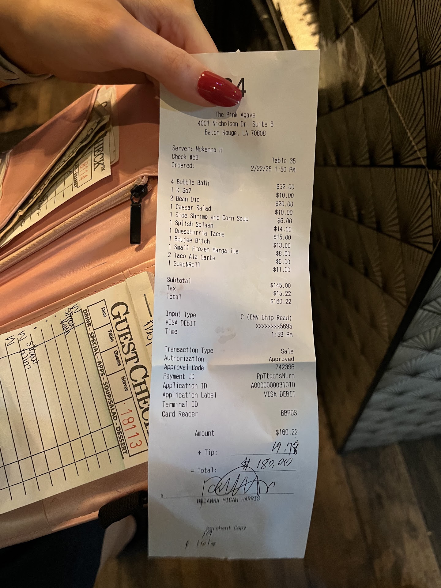 Extremely disappointing experience. I flew back home to Baton Rouge and suggested this establishment for a place to catch up w/ friends & family. Since I had never been, I was looking forward to the experience. This underwhelming experience alone reminded me of exactly why I left Baton Rouge and don't plan on returning. I wish I was joking. I could write an essay about my experience but I'll just bullet-point the high-lights, or maybe low-lights, I should say instead: -This place is sheer aesthetics, very cutesy but extremely cramped and small. I was sitting less than 12 inches from the next party. -Arrived with a party of 8 (4 adults & 4 children) at 12:30, after a large lunch hour rush. Was seated by 12:45 and by this point, 1/2 of the restaurant had cleared out. Host was quick to seat us and made accommodations for our large party inside which is the only compliment I can share. -By 1:45, after an hour of catching up, we realize our food & cocktails was still not at our table. Additionally our server, McKenna, had not been by even once to check on us or update us. Big mistake allowing ourselves to be distracted because Pink Agave definitely took advantage. -We start inquiring about McKenna's whereabouts & eventually she ends up at our table. We advise her that we had a 3:00pm engagement & would prefer to pay for the items received (1 Kso, 2 Bean Dips, 4 Bubble Baths, a Splish Splash & a Boujee B*tch) & to cancel the 2 remaining cocktails & 5 entrees we waited an hour for. She tells us that she cannot cancel the food we had already waited 60 minutes for. Not understanding the lack of accountability and blatant disregard for inconvenience, we requested a manager. -The manager refused to speak with us and instead made McKenna return to inform us they would not cancel but could box up the food and ALCOHOLIC BEVERAGES to-go....At this point I'm ready to walk out at the suggestion of us eating, drinking and driving to our next destination. The audacity of the manager. I advise McKenna that I want to speak to the manager, as I think the counter-offer is ludicrous and inconsiderate, to say the least. -The manager, Ash, who mind you is dressed in a soccer jersey and looks like a table busser comes to the table and informs us of the restaurant's inability to cancel food due to "policy". I wish we had walked out honestly, just to stick it to their policy. Mind you the food is still not out. -Because I am extremely embarrassed for even suggesting Pink Agave, I pick up $160 of the $210 tab. I am so ready to part ways. Despite the horrible service, I still tip McKenna $20 which was extremely generous despite the fact that she clearly forgot about our table. She apologized for the experience, citing the fact that she was "over-sat with a 6-top and 8-top" after our arrival for her negligent service. -As you can see from the receipt, it appears that the food wasn't actually rang in until 1:50 pm, about 5 minutes after we started looking for McKenna & almost 60 minutes after we ordered. There is no way a caesar salad, GuacNRoll, small soup, an order of QuesaBirria (3 tacos) and 2 chicken tacos a la carte took 60 minutes to prepare and I will part ways with Earth on that hill. -My card was swiped at 1:58 and by 2:10pm, after allowing my daughter to eat her now limp salad that sparsely covered the entire bottom of its' to-go box, I was running from Pink Agave. My advice to Pink Agave is to hire more experienced servers if you are going to enforce such stiff policies or maybe loosen your policies if you insist on hiring inexperienced college students for servers. Either way, best of luck because I will never return to this establishment and wouldn't even consider giving another location a try. Also, I'd like to add that the quesabirria was so bland that Pink Agave has inspired me to re-open my taco stand, Birrianna's! Be on the lookout this summer and fall for my grand re-opening. I have to show Baton Rouge what REAL birria tastes like, so thank you PA for that, at least. Check us out at @Birriannas on Insta! 0...