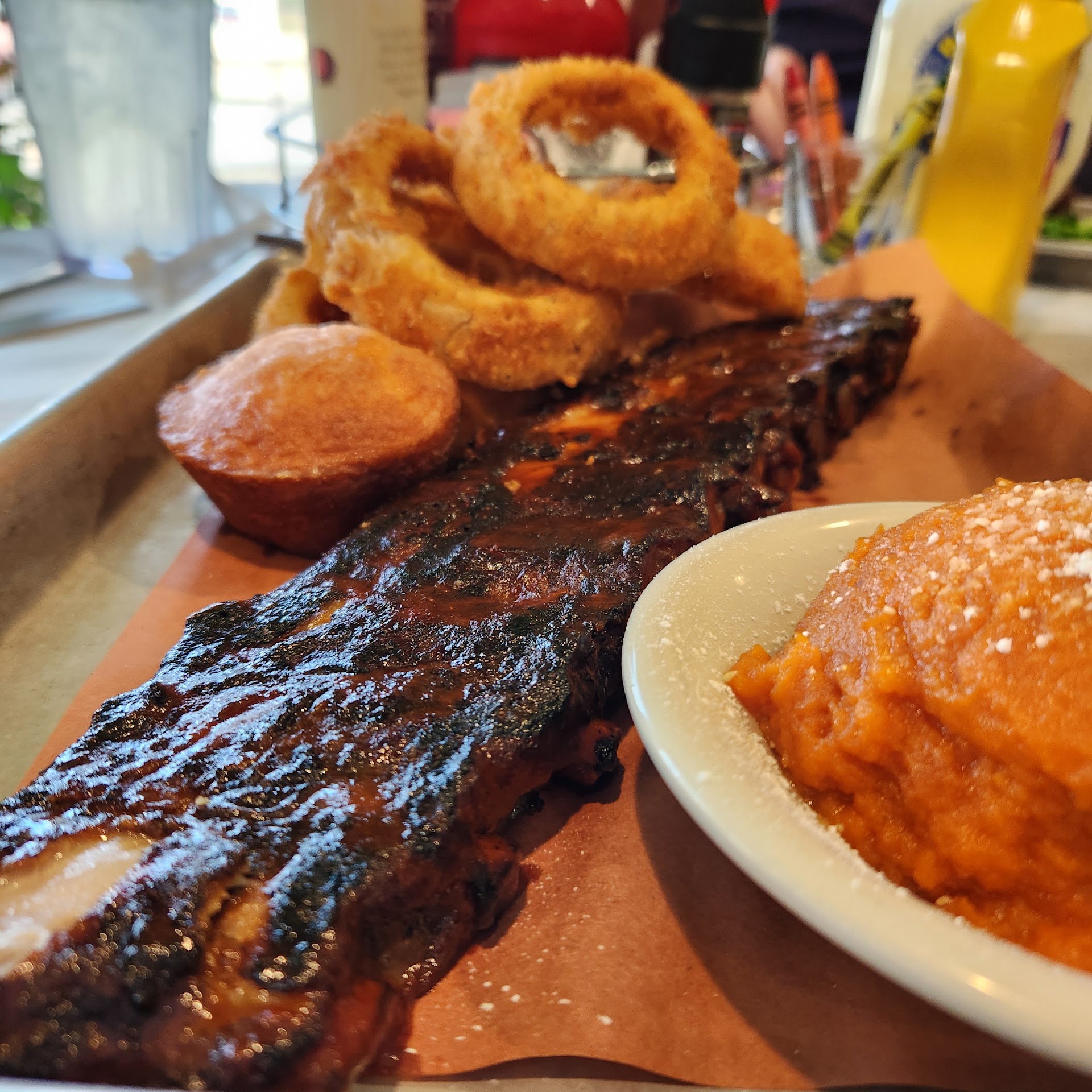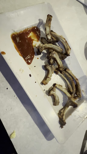 The waiter never told us his name. When I was asking him questions about menu items he seems unsure like he didn’t know about their food. We ordered all of our food and drinks at 4:12. Bread came out at 4:19 and fried pickles at 4:22. Bread/roll was good. Nothing out of the ordinary. The fried pickles were okay little too greasy than fried pickles usually are. The sauce is good that you dip them in. Biggest issue is when I unwrapped my napkin there was food that was on my knife and flaked off. We had to ask him for refills on our drinks several times. Food came out at 4:35. Unwrapped my silverware for second time and there was lettuce on my fork. The restaurant was very empty and quite I think there was only one or two other tables of people besides us in the restaurant. I was not impressed at all with the service or quality. The fries were not seasoned very bland & the Turkey was cold. The burnt ends were decent, defiantly not in my top of what I have had. The ribs were good, the Cajun seasoned potatoes were not seasoned just thrown in the deep fryer, very upset about this. The Mac and cheese was average. The fruit did not taste fresh the honey dews tastes old and I couldn’t eat anymore after 2 bites. I have heard great things about this place but the service, environment, utensils and food were all very much of a let down. There were tables around us that were dirty before we sat down and when we left. On the ticket our waiters name was Joseph G. My significant other ate here couple years ago and said it was to die for good, his opinion has changed and my opinion is not a good one. Employees were just standing outside the bathrooms cracking up joking and talking and my first thought is there is tables that need to be cleaned y’all should be working. The men’s bathroom was a typical men’s bathroom, but the women’s bathroom was DISGUSTING! Women’s used feminine products on the ground by the toilet. There was also a bunch of girls in there on their phones blocking the sink when I needed to wash my hands and had to ask them to move. Just was not a...