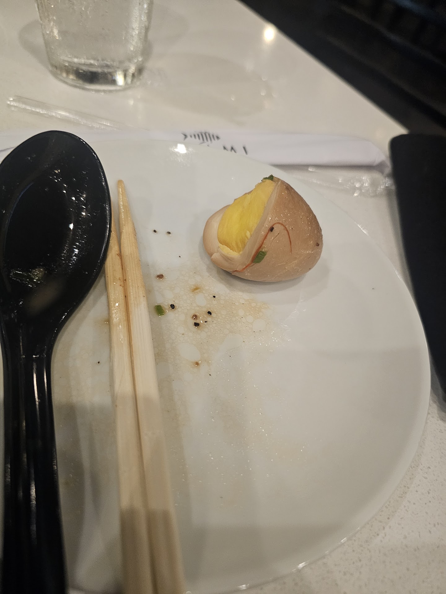 Ramen was made by the factory, all the way, hopefully/unhopefully at the same time, except the egg and enoki. Broth, seasoning, noodles, menma, shiitake, and chili were typical store-bought materials. Chashu was questionable, but I assume that it is also store-bought but just torched after warming them up. Noodles were not fully taken care of. It was sticking together, and it was a whole stuff under the soup. I assume that the chef took it out too early before the soup and toppings getting ready. But egg. Oh my, the reason why I said hopefully and unhopefully at the same time is because of its flavor. If you bought it from a store, throw them away. If not, your chef needs to learn a basic fundamental of cooking from the beginning again. Ajitamago is meant to be raw for yolk, just like a sunny side up fried egg. Besides the fact it was fully cooked, the biggest problem it had was its flavor. It was sour. I wasn't sure if the flavor was coming from its condition or a mistake during the prep. But it was too sour, so I don't even want to have another bite of it.