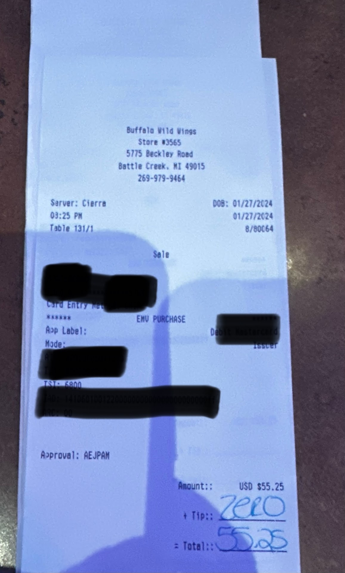 This was the worst experience I ever had. We were staying at the casino for the weekend. We decided to break away from the crowds at the casino and have some food and watch the fight. Well we went to watch the fight on a Saturday night, put our name in for about a 25 to 30 minute wait. We didn't get sat for over an hour and a half, ok fine we were not complaining about that at all. Until we sat down and our waitress couldn't even answer basic questions about the count of wings on some meals, well ok and she didn't even offer to go check with the kitchen or the menu just said I don't really know that. Making us order something else than. So we ordered traditional wings, a 15 count with 3 different flavors and I got the Boneless combo which she couldn't say how many came with that so I just picked 2 flavors and not even knowing how many wings I just even ordered! The resturant had slowed down now and our food wasn't coming out. When the food finally came out, it was like eating leftovers, ice cold wings and the sauces looking hard like paste from sitting for so long! The 15 count of wings came out to like 11 wings and they were all the same flavors, not the 3 I ordered, 1 flavor! The manager was no help and just blamed the kitchen, and didn't offer us anything for wasting 3 hours of our time and leaving at 9:45pm without dinner for that night now. Unacceptable!! This was absolutely the worst experience I had while taking a getaway without my children and choosing to go to Buffalo wild wings to watch a fight and eat my dinner. How awful! The waitress made sure I didn't leave with my receipt so I could not contact corporate about this situation either. I will never be back at a Buffalo wild wings like ever because of this and I will never recommend your place...