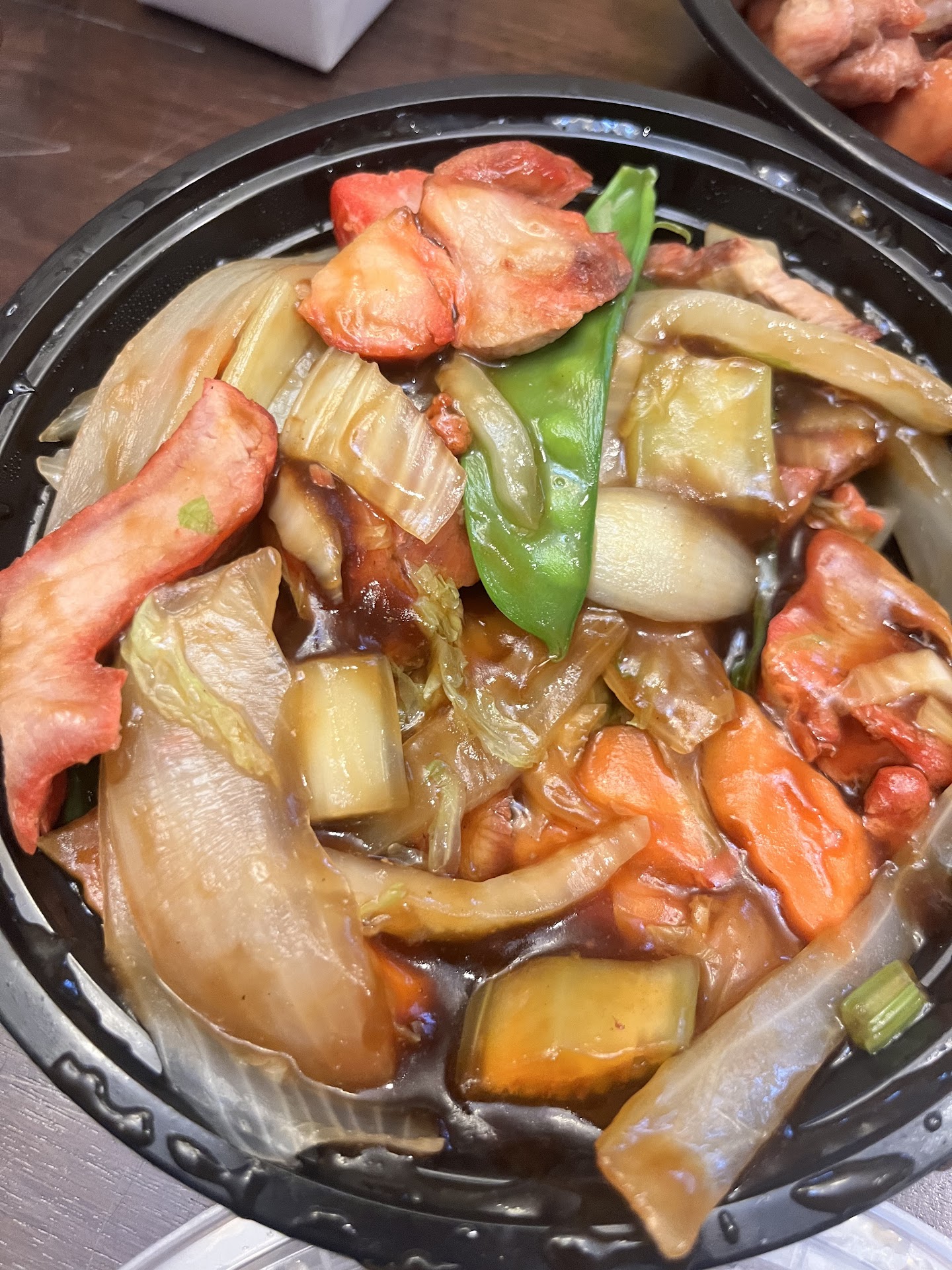 The pork chop suey was a complete disappointment and frankly awful. Now, I am a HUGE fan of pork chop suey. Ive been eating it for years and let me tell you.....this wasn't even close. Large chunks of red tinged roasted pork in a brown sauce (wait, did you just say "brown" sauce? Yes!! Ikr? Brown sauce!?!?) with carrots, pea pods, onions and celery. This should be called roasted pork with mixed vegetables. The listing stated "pork chop suey" mind you (not ROAST pork chop suey). First, let's go over exactly what pork chop suey is: thin sliced, fine strips of stir-fried pork, bean sprouts, celery, onion and plus/minus water chestnuts in a white sauce. (WHITE!! NEVER BROWN!) That's it folks. It's not difficult. If you're going to use roast pork, you state that in the menu listing. Completely shaking my head here. Check the picture.....