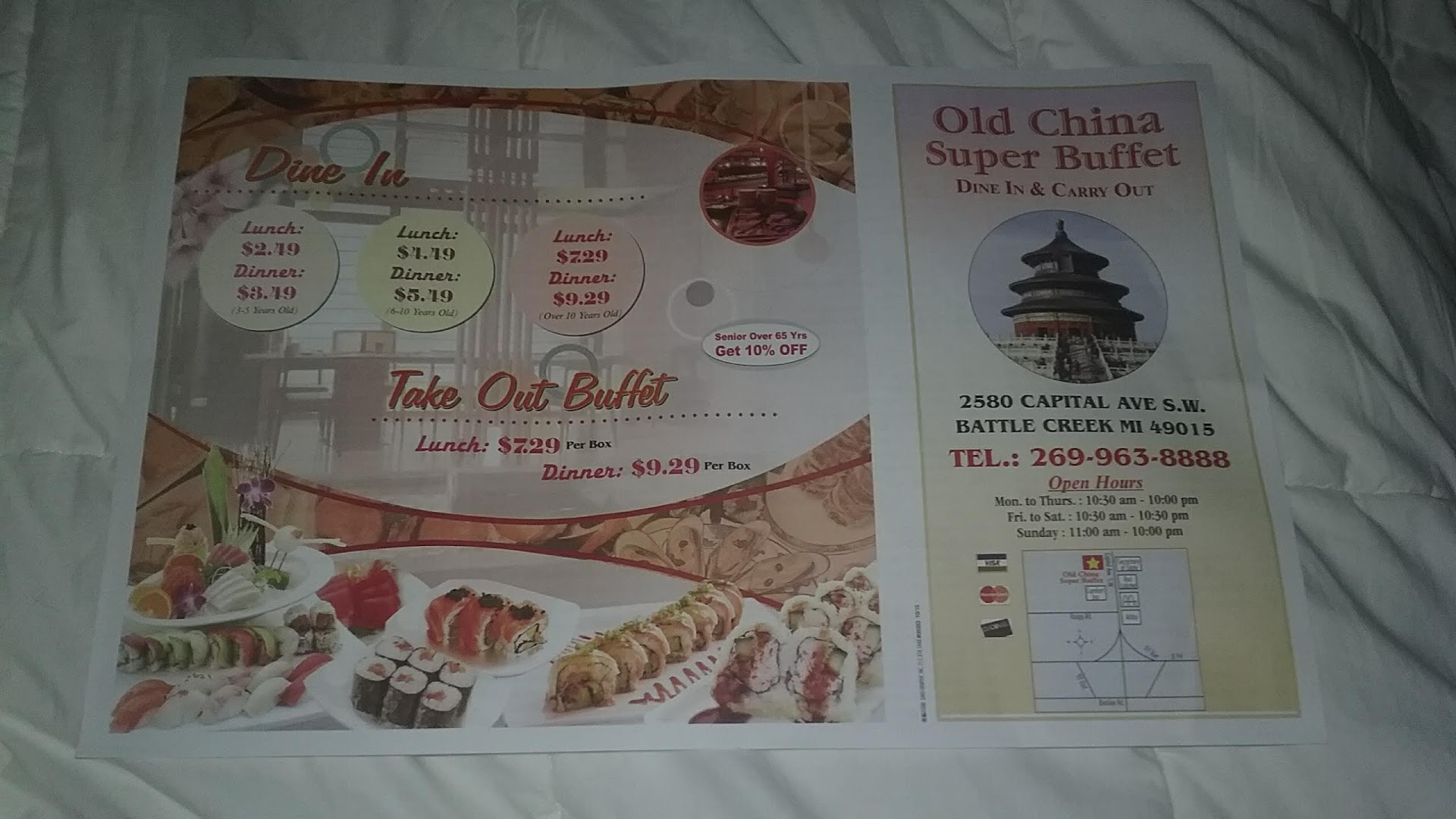 Stopped at the Old China Super Buffet at dinner time with my husband around 7:00 PM. Originally wanted to go to the Japanese restaurant just down the road next door, but they were closed (even though they said open on Google maps). Came in, both of us ate one plate. I finished just before him, and left to grab a second plate of food. While I was loading up my plate, my husband grabbed my arm and brought me back to the table to show me his plate. In the sauce (I believe either General Tsao or Honey chicken sauce) was what was CLEARLY a cockroach (body shape, antennas, 6 legs with little spindles off of it). My husband immediately brought this to the owner's attention, who inspected it and then initially claimed it was just a part of a vegetable. After my husband refuted this, the owner then conceded that it was an insect, but not a roach... The owner's explanation was that sometimes the vegetables from Meijer still have some insects on them but not to worry about it and he would only charge us for one person instead of two. My husband and I decided to just pay for the one plate (as he was given a daily meal stipend by the company he was training with while we were up here in Battle Creek). If we did not have that stipend, we would have fought even the one plate charge of almost $15. In the end, we just drove down the street and got Arby's instead. I was craving Chinese food (I'm 7 months pregnant...) but was far more happy to eat any food that did not contain insects in it. Honestly, this experience has turned me off from all buffets.