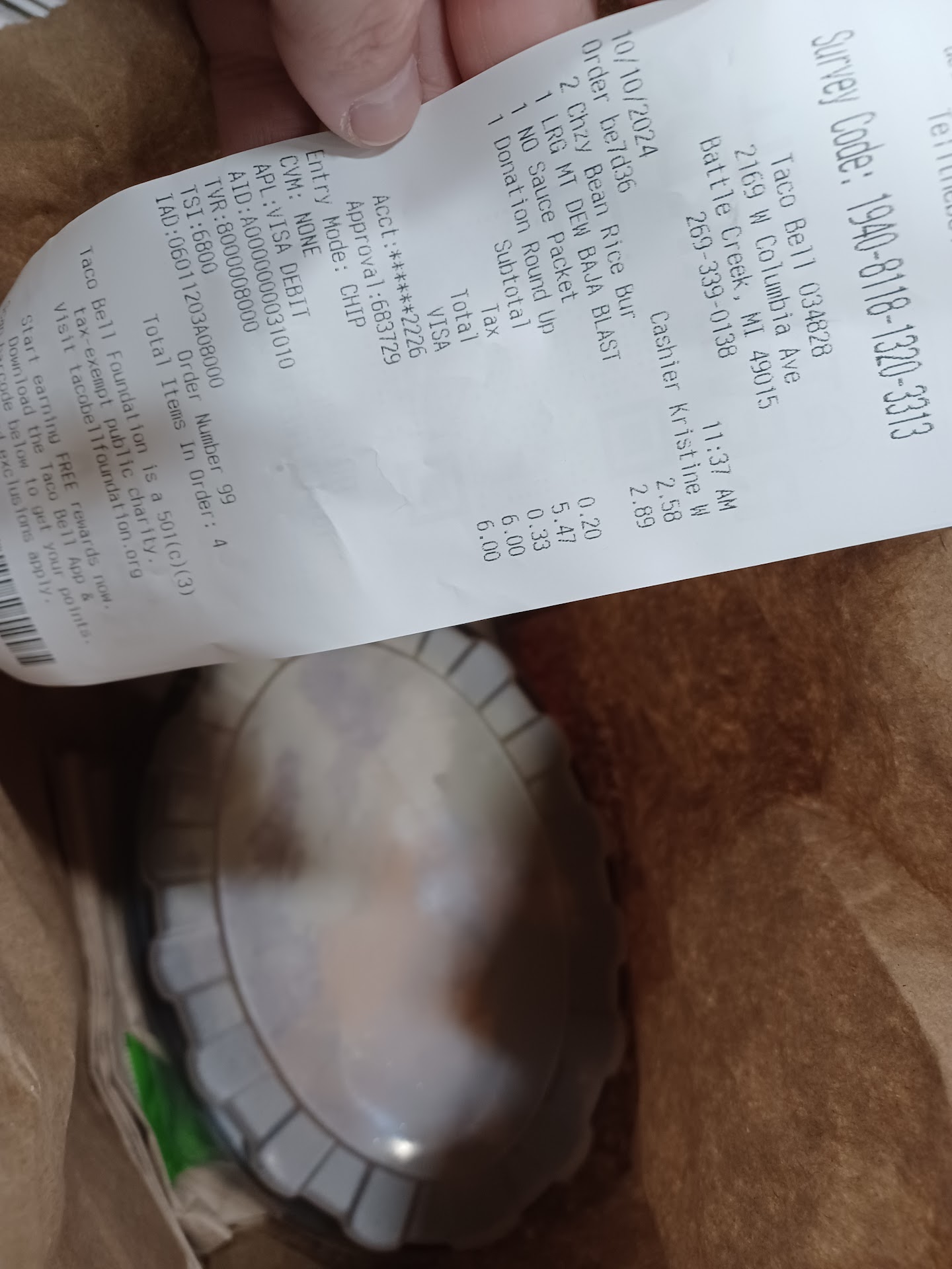 When I went to pay, I requested a receipt, but I was told the printer was down—though I didn’t think much of it at the time. Once i was handed the food, i looked it over, and what i saw with out un-wrapping anything looked to be complete. When I got home and checked the order, I was shocked. Instead of two complete Number 11 meals and the large nacho cheese fry I ordered, there was only one full meal and half of a chicken cascade wrapped up to make it appear as if there were two completed number 11 meals. This was not only disappointing but also frustrating after such a long wait.