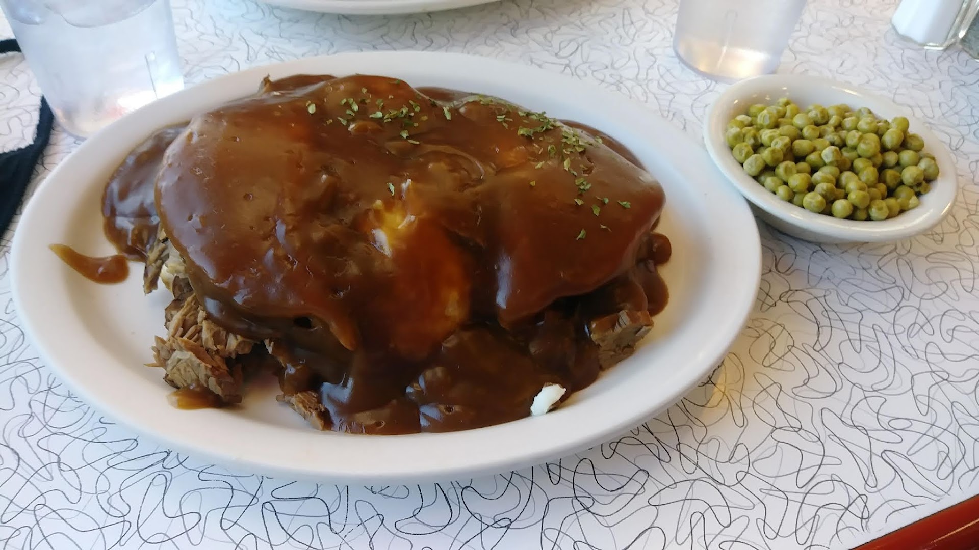 The meat and bread was easy to cut with a fork, the mashed potatoes and gravy were smooth on the lips before swallowing, and the meal overall was presented well and hot enough. There were even peas served as a side dish. This was great because I never had a side dish served with a hot beef sandwich before, and the peas were good too.