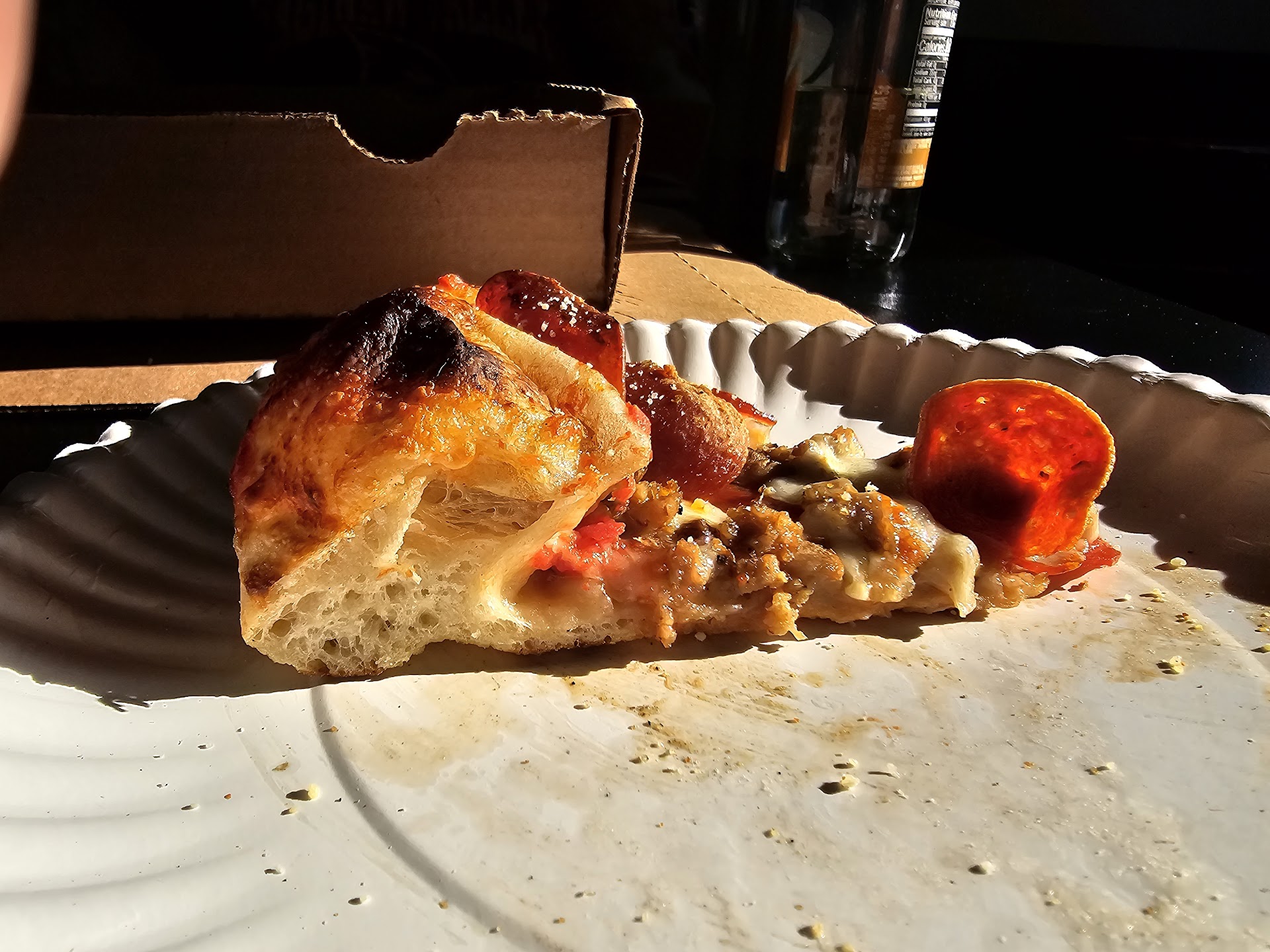 This was my first time eating here. I ate inside the restaurant. I ordered the Don Corleon Pizza. It was so delicious! The ingredients were very fresh and the crust was baked to perfection. I've read reviews and comments that said their pizzas come out burnt. I did not experience this. The staff was very friendly and I would definitely return for the food. I would like to leave an additional comment about the physical appearance of this restaurant. Upon entering I noticed it was a small place, quaint and had potential. I felt that the owners are not bringing out the full potential of this establishment as it lacked spirit in the decor, and was not clean enough for a place where people dine and food is prepared and eaten. I noticed dirty floors, chairs, tables and walls. There were cob webs in the corners of the room. The sign on the side of the building said, Gulino's Pizza and Sons. It should have been written, Gulino's and Son's Pizza.