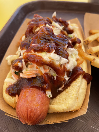 Other factors that made it an unpleasant experience was 1. there was a wait. I broke my rule of "always order on the app" because it didn't seem like a very long line (it was around 1:00 pm). Always order on the app! 2. It was impossible to find seating indoors and outdoors so I had to trek over to the front of the Plaza Restaurant and sit at their outdoor seating. 3. Napkins and things are further inside and there were none by the doors so I never got any and with bbq sauce smothering the hot dog you really need napkins. 4. Everyone in the reviews say it's "cheap" but it's not cheap at all! The bbq hotdog alone was $13.29 and they only offered a 30oz drink! for 4.99. I ended up paying $19+ for a hot dog, a small serving of fries, and a drink which I couldn't finish but they feel it's justified to charge you so much but they don't offer a smaller size?