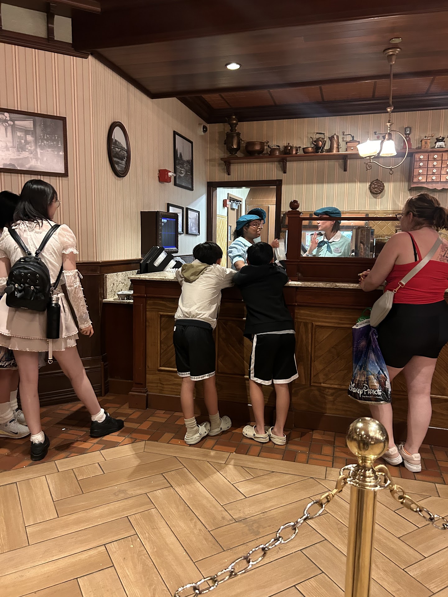 This location themes itself much like the rest of Main Street, even using the original Starbucks logo for a little authenticity. Inside looks nice, but because of their high volume has no indoor seating. If you're looking for a place to sit, the hub grass (in front of Cinderella's Castle) is nice, or you can walk down Center Street, the alley that branches off of Main Street before the bakery.