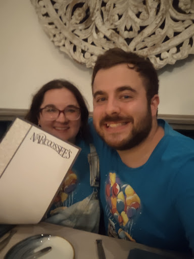 And lastly, dessert. As mentioned earlier we got free champagne and.... Chocolate!!! We got some chocolate WITH a card with our last name on it! That's incredible, I've never seen a restaurant do that before for a special occasion!!! It was good chocolate too! Our main dessert was Pavlova, as seen on Bluey! It wasn't what we were expecting, but in a good way! We were expecting like an Australian version of tres leches cake, but it's actually a meringue dessert! It was delicious too!
