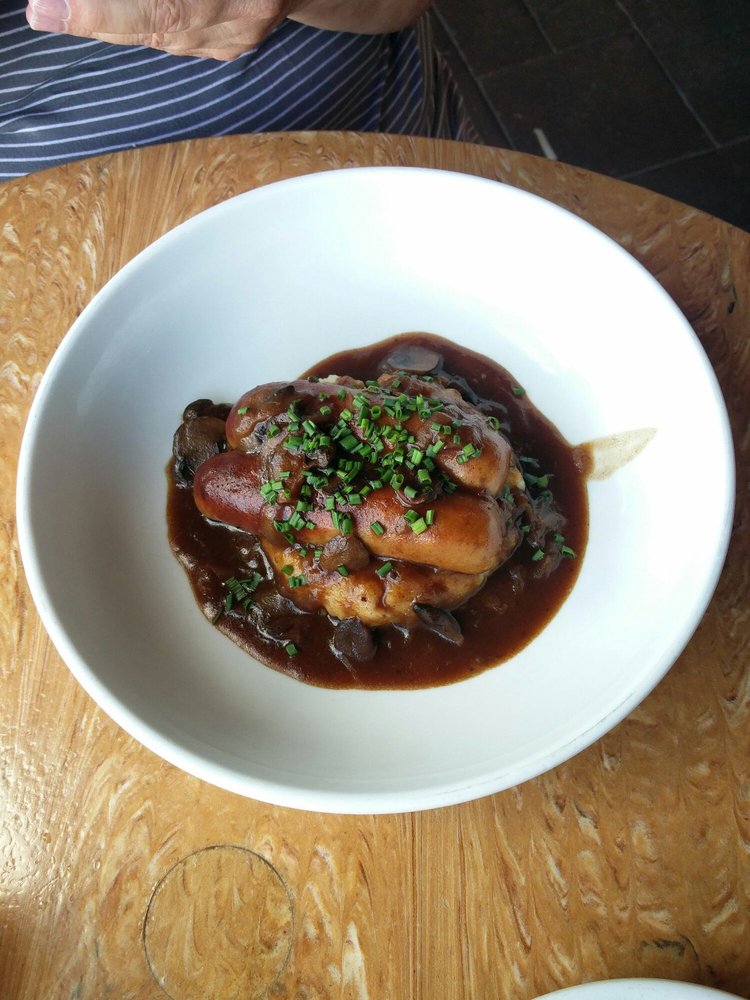 For the appetizer we opted for the House-made English Pasty, which was a chicken and leek filled puff pastry; $13 seemed a high price tag for this dish, but the flavors were definitely there. The chicken and leek filling was creamy, the puff pastry was toasted and gave a nice crunch and the pickled onion and tomato salad that accompanied the dish was tart and crisp. The entree that we ordered was the Bangers and Mash: a traditional English sausage with Colcannon potatoes, roasted mushrooms, caramelized onion jam, and red wine demi. The sausage itself was pretty standard, and the mashed potatoes were too liquidy for my taste, but the real star of the dish was surprisingly the combination of the roasted mushrooms, red wine demi and onion jam.