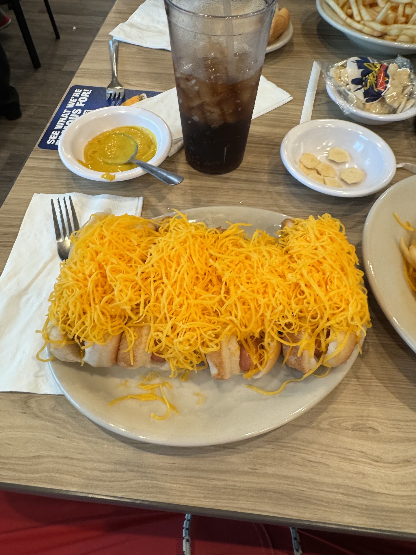 I ordered the 2 cheese coneys, a side of regular fries, and a Coke...and these totaled nearly $14. Because I could get this same exact meal (but with better portion sizing) back home for half of this price loses one star off the food.
