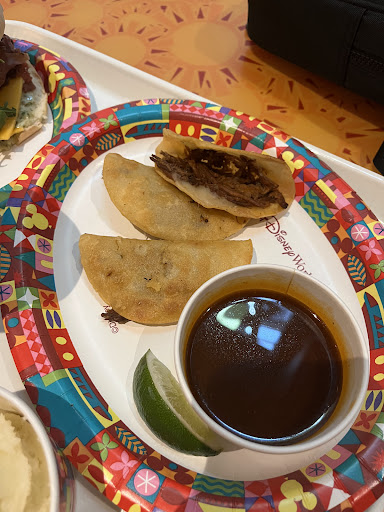 We have come here a lot of times throughout our visits to Epcot. This time, I got the birria tacos. When I went to the station with the tacos, I asked if I could get them without cilantro and onion. They informed me that they come on the side anyway, and then served me the tacos. I'll admit, I was a little disappointed with the size of the tacos and the quality. It was clear that they had just been sitting there for a while because they were pretty dry. I also went and got a side of mashed potatoes because I felt like the three tacos were not going to be enough to satiate me. They have full-size cups available for water, which is awesome. The food itself was decent. The tacos were dry as mentioned, and the consomme that they came with did little to help that. I put the consomme in my mashed potatoes which made them even more flavorful. All in all, I've had really great meals here so I'm not going to ding them for this one meal...