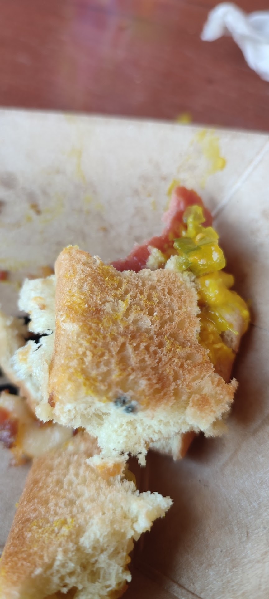 It was disconcerting to realize that we had unknowingly consumed moldy bread during our meal. The mold being hidden on the back of the bread made it impossible for us to notice until the very end. This means that we ingested a significant portion of mold, unknowingly subjecting ourselves to potential health risks.