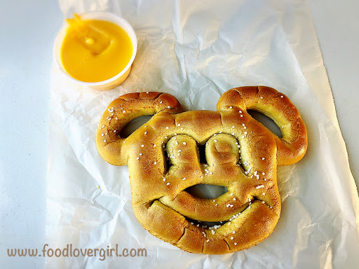 We came here for pretzels. If you look on the menu, here, the standard pretzel comes with cheese sauce for an overall price of an extra dollar. Whereas elsewhere in the park the pretzel is a dollar cheaper, and you pay an upcharge of $1 if you want the cheese sauce. Since one member in my party didn’t want the cheese sauce, she waited in the regular line to ask if she could be charged $1 less if she didn’t want the cheese sauce and they accommodated her. We also mobile ordered the cream cheese stuffed pretzel. It is so good! The mobile order line is efficient and moves quickly. There is some seating around the...