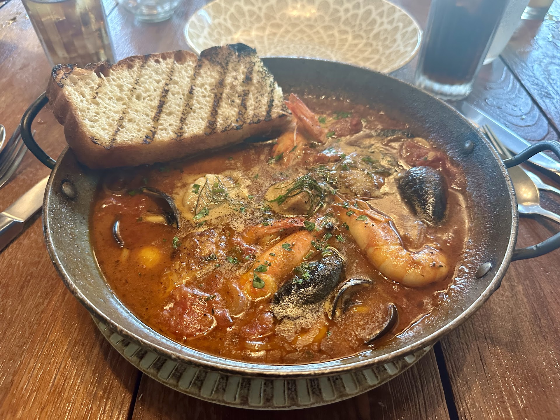 I was torn between the bouillabaisse and the fish almandine, and ultimately went with the bouillabaisse. It was very good, but next time, I will order the almandine. One person in our party had that, and they raved about how delicious it was. Two people in our party had the shrimp and grits, which was good, but very rich. One person had the half chicken, and said it was excellent. One person had the burger, and really liked it. Everything we ate here was delicious.