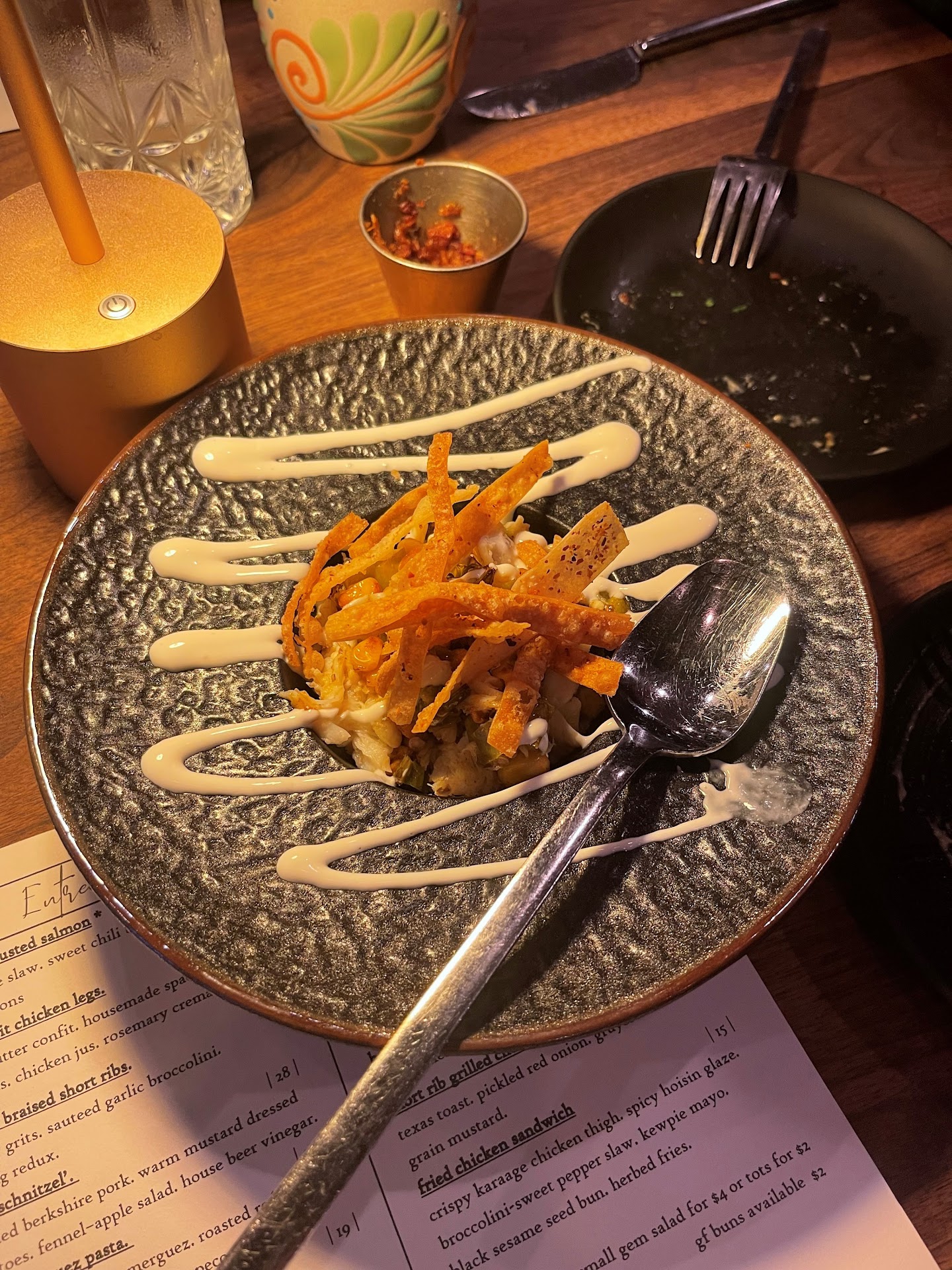 First course: Drinks: the orange & the watermelon. The orange was boozy and the nutmeg on top made it a very cozy drink. The watermelon was just flat out good with the perfect tasting of watermelon. Apps: loaded lobster tots & crab salad (pictured) The lobster tots were DELICIOUS!! Generous portion of lobster meat on top of crispy tots and a yummy cheese sauce. The crab salad was one of my favorite dishes. Super lite and unique with the southwest flavors incorporated.