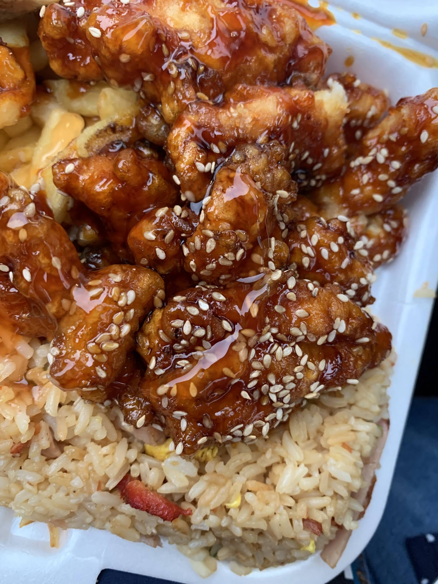 I ordered sesame chicken and fried rice, with an appetizer of Crab Rangoons ("Mariposas"). What I got was a poor imitation of Chinese food, with lazy cooking, or worse, cutting corners that left the food tasteless. The Crab Rangoons were not enveloped in wonton skins, but hard doughs, and the insides were dry, and without crab, or red pepper, or green onion. The sesame chicken was cut in pieces that were too large, breaded, fried (not in a hot wok) and dunked in a sweet and sour sauce, instead of a sesame sauce, and sprinkled with, no exageration, four sesame seeds. The rice was hard and cold and totally tasteless. So much so that three packets of soy sauce could not make it edible. This was a very disappointing meal. I do not recommend this restaurant. It baffles me that it has a four star rating, it does...