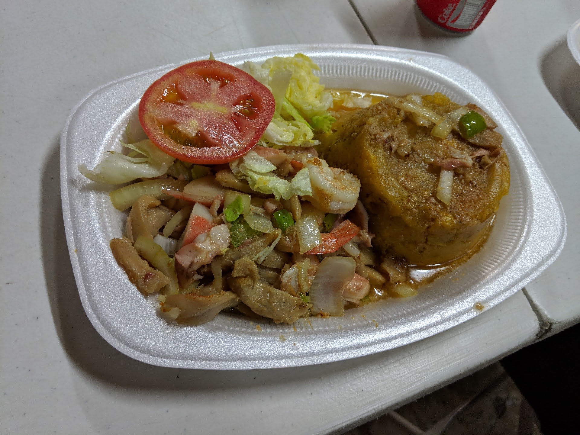 I'm being a tourist and I hate chain restaurants and haute fakery. I wanted a place with outdoor seating ambience and lots of local people. When I finally felt hungry this is what I found. Mainlander tourists with weird ideas about rhe rustic look or feel might find this place strange, but I've been around the world a bit and this looks a perfect good time. The menu consists of various combos of plantains and seafood, but there are land meats too. The menu is subtitled in English so just walk up. Secret tip on the menu, on the bottom are assorted meat pies. Get one. They are super cheap and delicious. In fact, if I was at home minding my diet the meat pie would have been most of a...