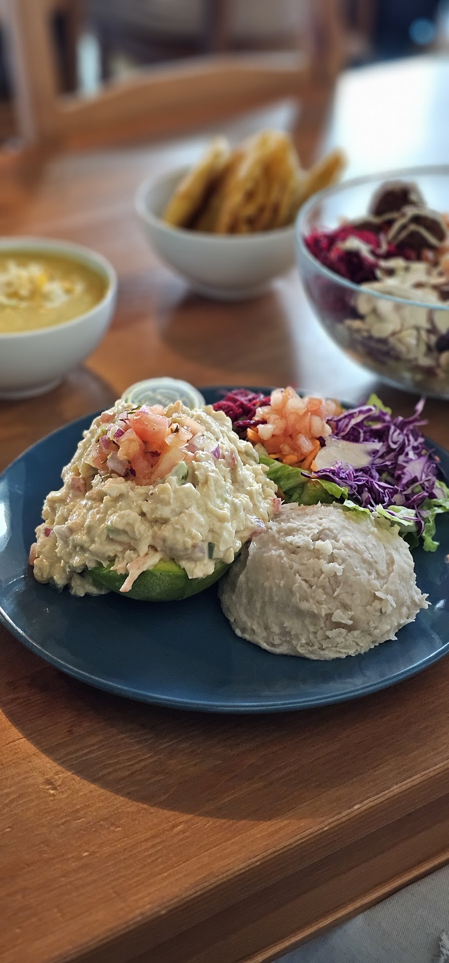 I started with the soup of the day, a broccoli cheddar one, vegan of course, which was on point! I ordered the small one, but it was plenty; it could be shared. Then I had the stuffed Avocado with TuNo, a chickpea dish mimicking tuna, paired with mashed taro, which was a flavorful delight. The vegan sauce on the cold TuNo was perfectly balanced, and the breadfruit tostones (which I ordered separately) were crunchy and fresh. Combining TuNo with the tostones was pure magic, creating an explosion of flavors in my mouth. 🥑🍲 I also tried the Mediterranean salad, which featured authentic falafels; though, I wished for more than three small balls. The salad overall was very tasty, and a really large bowl.
