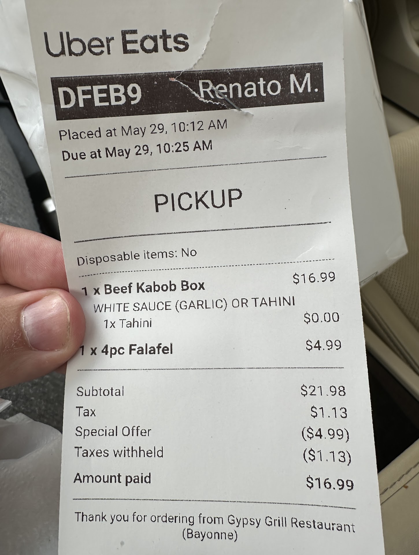 Per Uber eats, they open at 10am so I placed an order around 10:20am and arrived at the estimated time of 10:35am. The front door was closed and the order wasn’t ready at that time. I waited around 10 minutes and the attendant, who was polite and friendly, came outside to bring my order. This is acceptable since they’ve recently opened the Bayonne location and are still making the final adjustments.