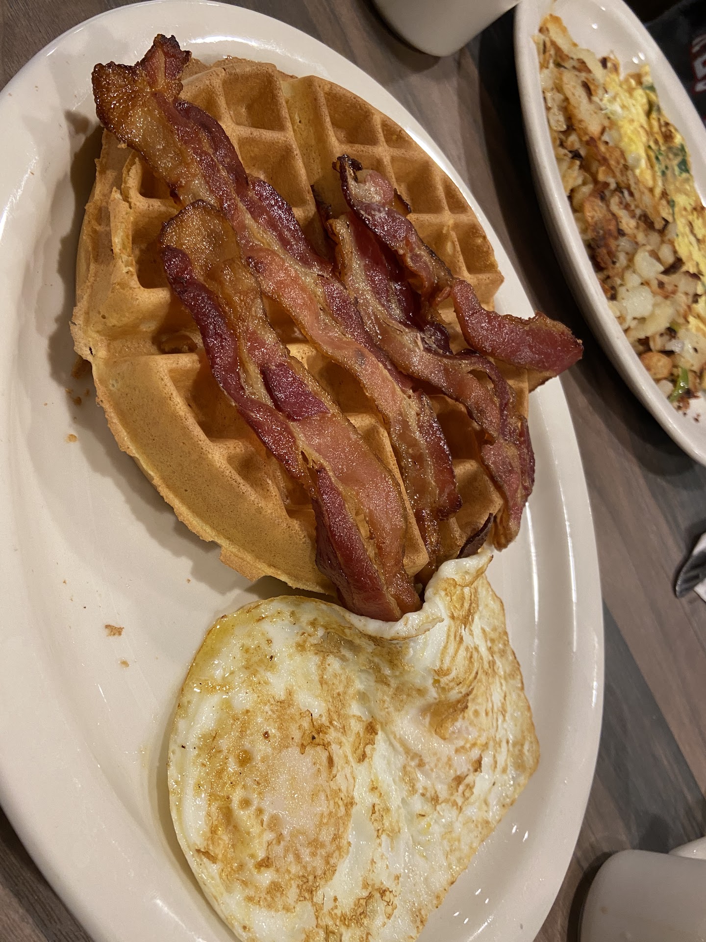 The waffle was excellent, light and fluffy served with butter and syrup. I got bacon and 2 eggs with it too for $11. My friend got an omelet and loved it, she said it was packed with feta cheese. Also came with 2 pieces toast and jam and potatoes which was a lot of food. We both got hot chocolate and it was chocolatey and rich and delicious with whipped cream on top.