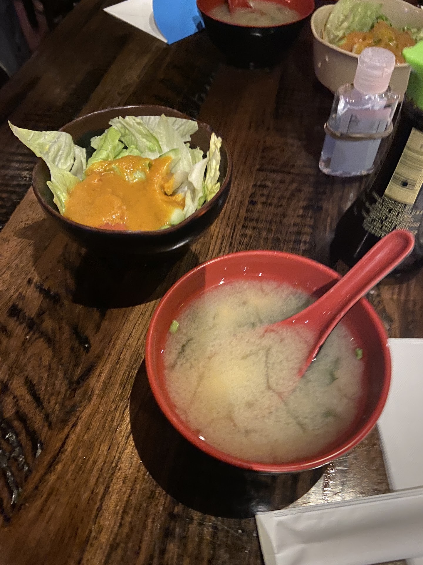 Waitresses were nice and attentive even though it was busy. They did forget to give us a menu but we looked ahead of time and knew what we wanted. We got the sushi for 2 which came on a boat, presentation was very nice. The sushi was very fresh, no complaints. Came with soup and salad for both of us. Food was very good but sushi is not filling so we split an eel roll. And then we each got fried ice cream for dessert and we each had a cocktail. Close to $100 for the bill. The fried ice cream was delicious, very light tempura batter they put on it. Definitely not pre made. And the green tea ice cream was a great strong green tea flavor, sometimes green tea ice cream just tastes like vanilla but no this was the real deal. Sake sampler my husband got he liked a lot and I got the blue lagoon drink which was very sweet and tropical tasting. I like blue curaçao so that’s why I got it. And it was good!