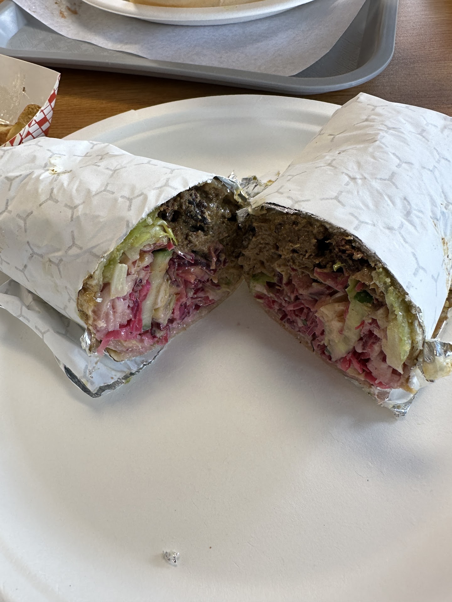 Stopped by here for what was supposed to be a quick lunch with my husband. We ordered two sandwiches one on the pide bread and the other one on the lavas wrap. We also got fries and a water. Considering there’s only like two items on the menu. I was expecting to have the food out pretty quick. The cashier told us that she’d bring it out when it was ready. I watched closely as the man was making the food, who was clearly still being trained. I noticed that he didn’t put any sauce on the wrap, but still waited to see if maybe I missed it. I noticed that my husband’s food was done first and the wrap was still being made. It took so long that by the time the food came out my husband‘s sandwich was ice cold. I open my wrap and there’s no sauce. So I took it back and asked for it to be remade, which again took time. When it finally came out and we started eating, I realized that the meat was very dry and hard and tough and didn’t have much flavor to it. Also, my wrap was mainly veggies, specifically onions, not much meat. The sauces had no flavor. The hot sauce was not spicy at all. It tasted like watered down ketchup. The fries were OK. They make them fresh with the skin on but a bit greasy and salty. Overall, I will not be going back to this place and do not recommend it. It was not worth $30. It needs a...