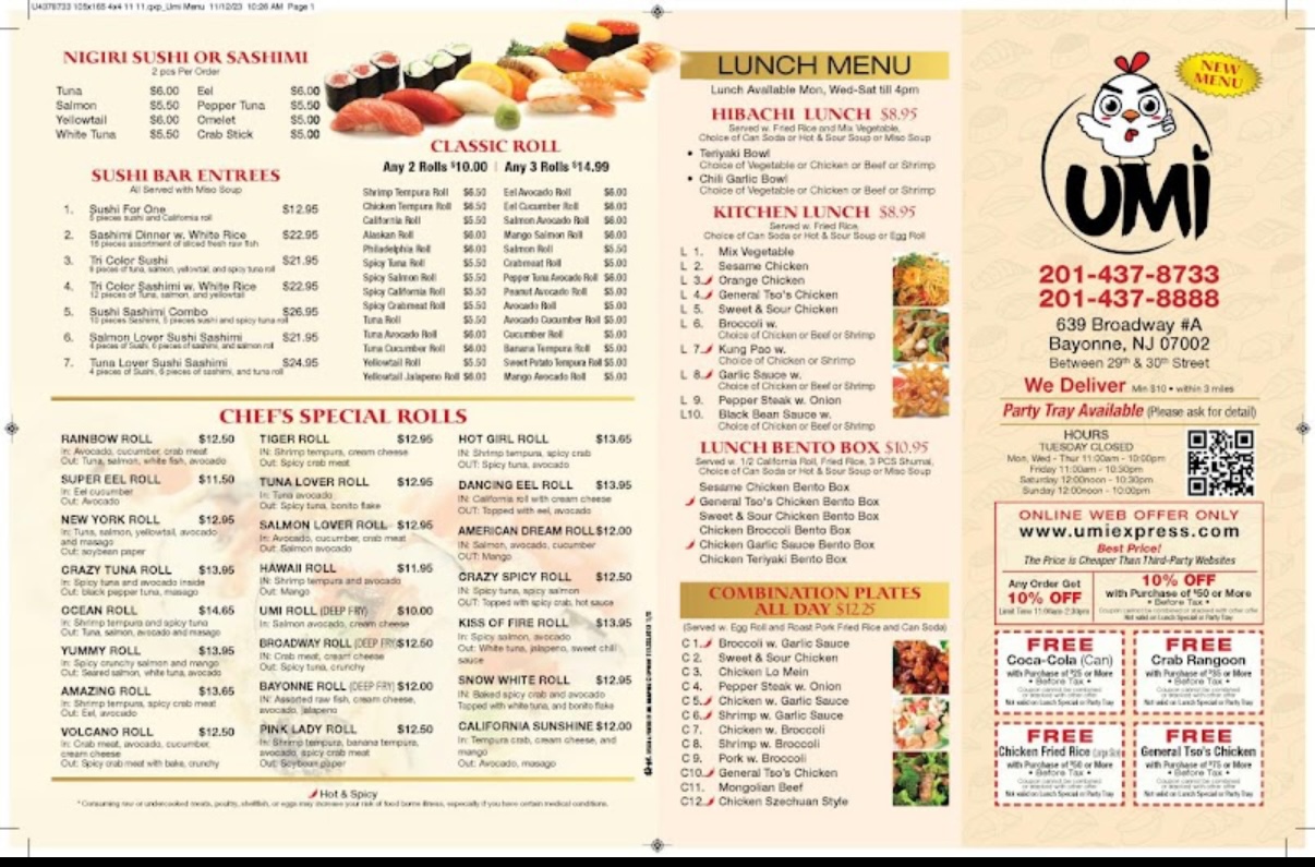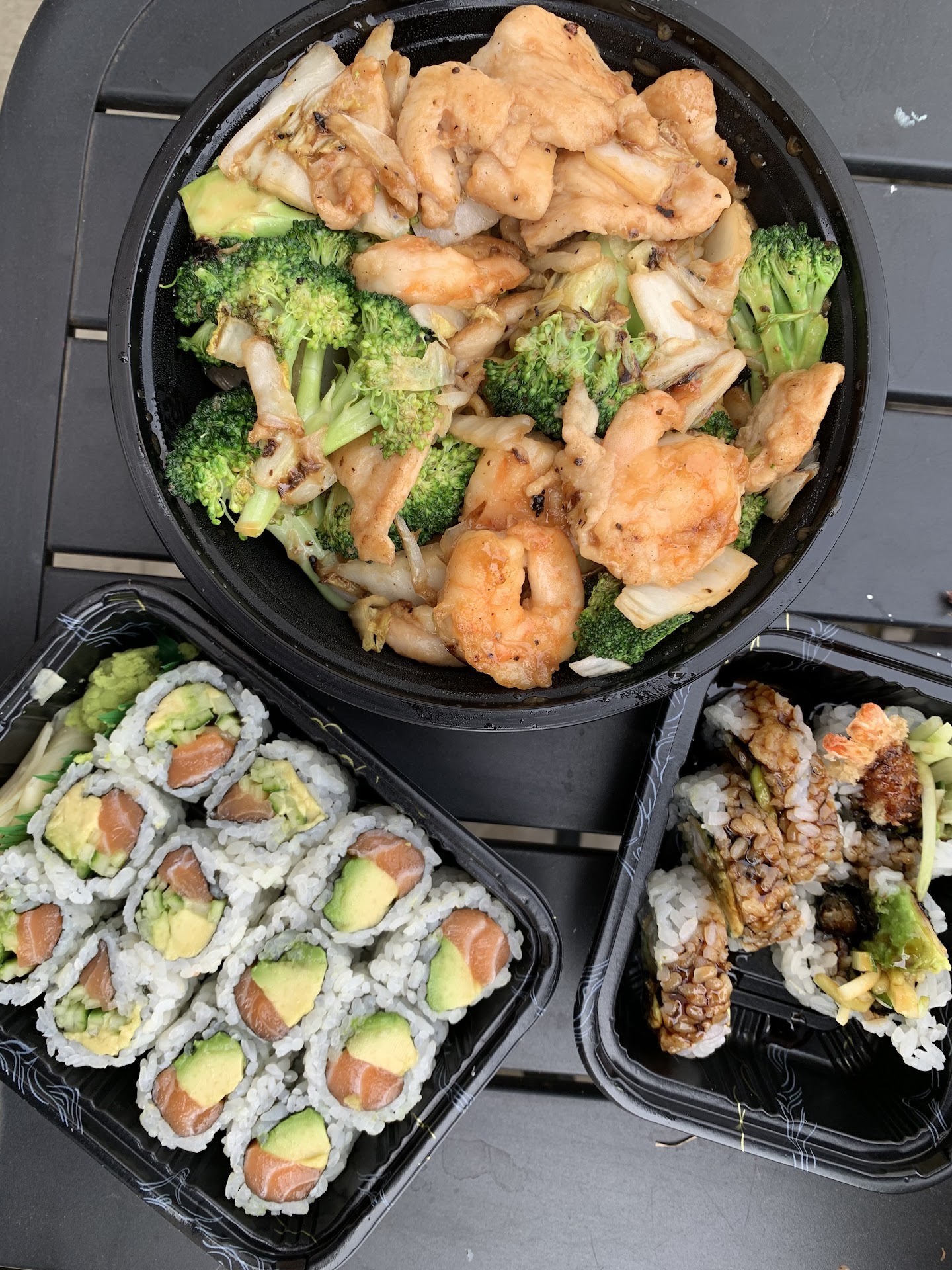 Read moreI was able to talk my Husband into ordering from here. He says that he doesn't like Sushi. But I certainly do! He decided to get the Hibachi bowl. You get different steps on ordering. This makes it extremely easy. He picked lo mein, shrimp and extra shrimp. It's a 3$ extra charge but, they really give you a big portion! He chose baby corn, and 2 more vegetables. For the sauce, I asked if I could have duck sauce. The gentleman was extremely sweet and professional. Now my turn, they have any 3 rolls of Sushi for 9.99. I chose The California Roll. The Sweet Potato Roll. And I had the Vegetable Roll. I tried to see how I like these items before I.start ordering the Rainbow Roll and a few more raw fish rolls. The food is definitely prepared fresh. It takes a little time to get to you. But, it is honestly worth the wait! The best thing happened. I saw my Husband looking over at my container. I prodded him a little and he agreed to try the California Roll. He was extremely impressed because when we ordered again he said " Can you get an extra CR? Incase he wants to pick on it. He ate the whole thing! Next time I will get the Philadelphia Roll and ease him into it. So, Umi Kitchen...