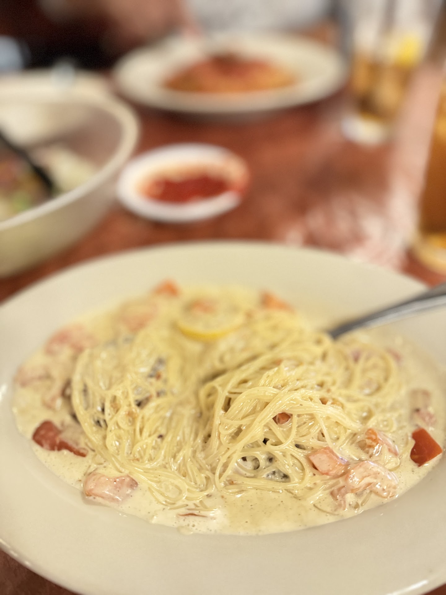 Read moreThe restaurant itself brings to mind what a restaurant in Italy might look like. The painted walls are intended to resemble the countryside. There's a fountain if you'd like to toss in a coin for good luck. The sign outside states Antonio's serves the "freshest" Italian food in Baytown. The few times I've visited, I've ordered the same item, therefore I cannot state whether or not all their food is the "freshest." The two meatballs served on the spaghetti and meatballs are nicely sized. I'd prefer them to be a little bigger (because I like the flavor and want more). The meatballs are not so spicy they ruin the flavor of the spaghetti sauce. The spaghetti sauce itself is more tomato flavored than I prefer. Since the meal is "spaghetti and meatballs," the sauce is sans meat. At least every time I've ordered "spaghetti and meatballs" there has been no meat in the sauce. It could probably be ordered, which I will do next time I go. The bread "knots" are brought to the table hot, soft and delicious. They're probably my favorite. The fresh salad has a light Italian dressing already applied. I don't like my salad dressing to overpower me and their dressing does not. All the times I've visited, the waitstaff have been friendly, professional and checked on us frequently but not too frequently. Fresh drinks refills appeared at the right times. Dishes were whisked away when empty. Each visit was pleasant. I'm sure I'll return in the future. (My friend got the steak rosemary ravioli, if I recall. It looked wonderful. I might have to...