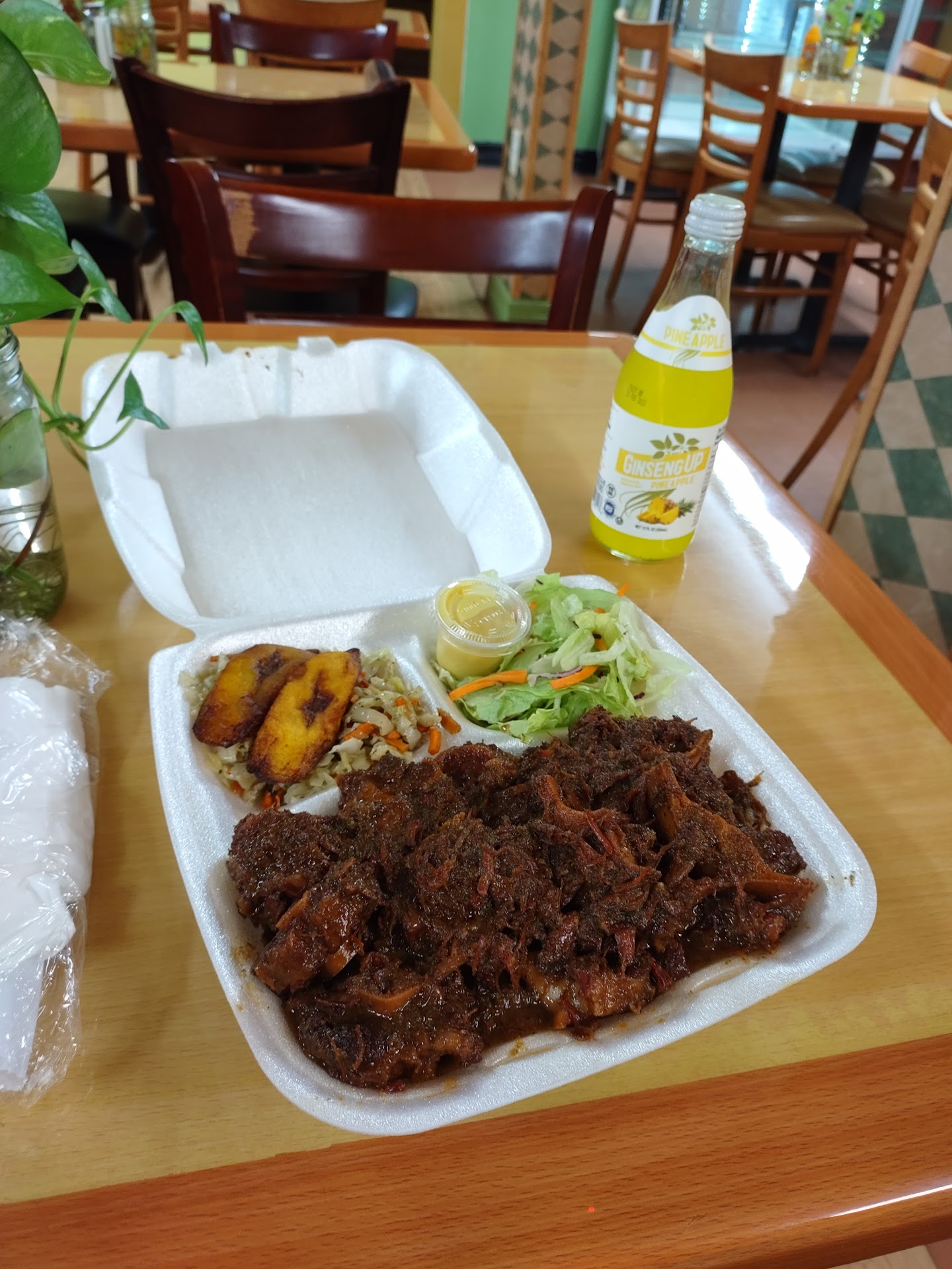 Ordered to go: We placed and order over the phone. The man that answered was kind and patient as it was our first time trying this restaurant. First issue was that they didn’t have everything on the menu. We were trying the Three Treasures (you can pick 3 meats and rice). They didn’t have the jerk chicken, jerk beef ribs, goat, or Caribbean fried rice . Of course we wanted to try the Caribbean fried rice, jerk chicken and jerk ribs. We ordered alternatives anyway as we wanted to give the restaurant a chance. We ordered 3 orders of oxtails, curry chicken, curry beef, and stew chicken. We also ordered one beef patty. They give you plantains and a random salad with Italian dressing (which made no sense). The portion sizes of the meats were a nice size except for the rice and peas. The curry was flavorless and oily. The beef in the curry beef was extremely dry. The stew chicken was okay at best. The oxtails were very small (they give you a lot though) and we’re also okay at best regarding flavor. The rice and peas were also flavorless. The beef patty was okay. The menu price online is very different than what you are charged. I’m assuming they have not updated their online menu. Overall, the food was overpriced for under-seasoned food. I would recommend trying for yourself, but understand that if you want good flavorful Caribbean food you may want to...