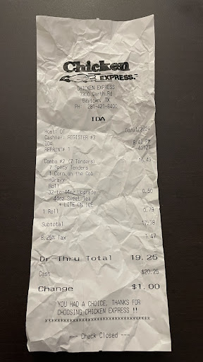 Chicken Express says it all. A fast food chicken house that has all the trimmings that you'd expect at a fried chicken place. They also have catfish platters. Very good catfish, not that farm raised practically bland and no taste catfish. They have a variety of menu items, combos, sides, and if you're in a hurry and just want something small, they have a snack pack. Their hush puppies and rolls are to die for!!! Those side items are very good too. The mash potatoes are like your mom made at home. No artificial instant taste here. You may want to get two sides of them. Ok. Ok. Man on with the story! I have never got a plate of food that was cold. The entrees are always hot !! They call you by name and are always friendly! Oh, and if you want chicken , you can order what chicken pieces you want. Oh, and if they make a boo boo.... they will apologize to the max and then some. I've been there many times and only once did they goof . They apologized practically the entire time that I was there and it was really a trivial matter. My advice, if you want a good dining experience, great catfish (from a fast food place, which really is unheard of), chicken, entrees, sides and fixings and all kind of possibilities. GO CHICKEN EXPRESS! OH, why didn't I give them 5 stars... to make you read this far....
