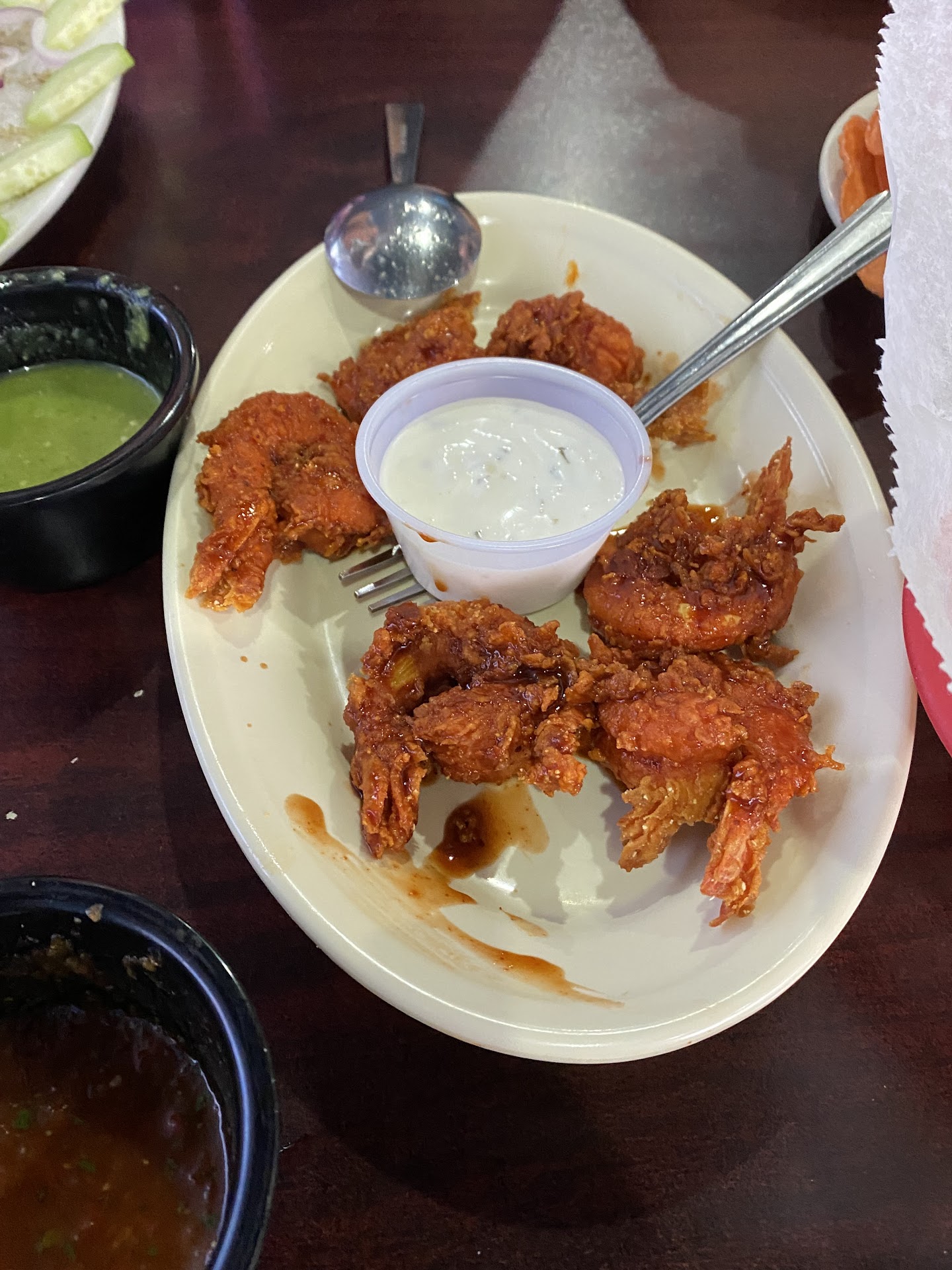 I love trying new places, my son wanted shrimp & google suggested this place. They shouldnât, how it has 4 stars I do not understand. I had the grilled shrimp over dirty rice, mixed peppers/onions, salad, roll & my son had the very pricey $8 kids meal of 4 pieces of oddly colored fried shrimp & a small amount of fries. I assumed at that price the drink would be included in the kids meal. The shrimp is not properly cleaned, which is just lazy & gross. My son is 4. They charged for his refill on his small kid sized cup as 2 32oz drinks. I brought it to their attention and they didnât seem to care to make the over charge right. Chips were stale, salsas were on the runny side but tasted fine. The food had an okay taste but nothing impressive. âSaladâ is a joke, literally lettuce with a slice of tomato on it & watered down dressing. The roll was straight out of a package that clearly doesnât get closed properly it was as stale as the chips. The waitress speaks & understands minimal English, which isnât normally a problem if guests are still properly taken care of⊠there was a table of elderly ladies next to me which 1/2 didnât get their drinks or the right drink. Food was incorrect. I do not think I will waste my time in coming back. $40 for lunch for me & my 4 year old is ridiculous. The positive reviews have to be from employees or friends/family. Way too many negative experiences also reviewed to have the 4-5 star...