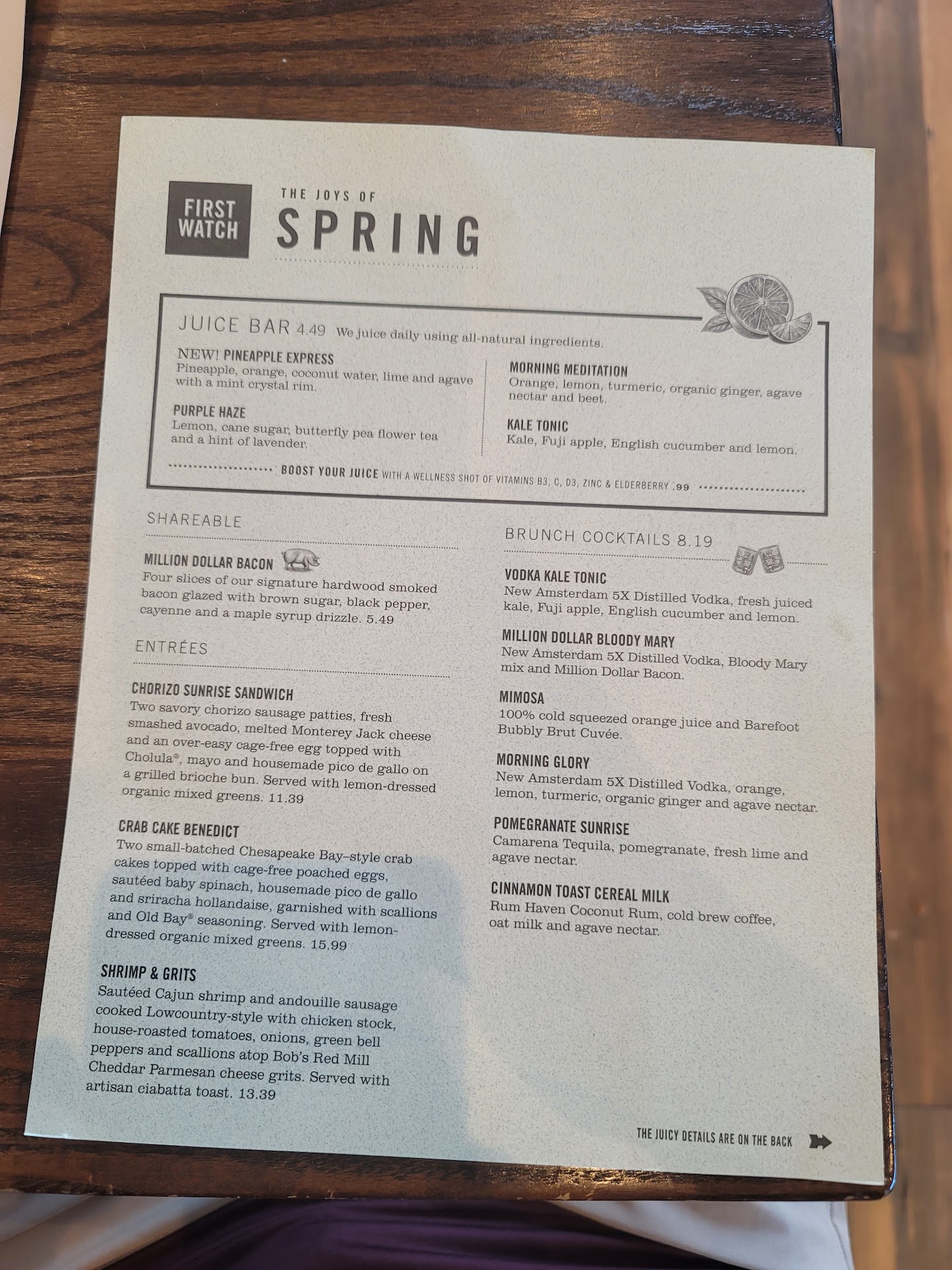 Read moreI have been coming to this First Watch for a couple years now and let me tell you I love it here! The plating is taken to consideration as much as the ingredients that they use for all of this delicious, fresh food. When I go to a restaurant, I usually order the same thing since Iâm a vegetarian but at First Watch, I am able to try new things which is always satisfying. All of the servers are kind and friendly and I appreciate their service. I do suggest that the servers make sure to write down all orders and that they come back to check on their customers after 2 minutes or 2 bites within the customers receiving their food. I have noticed that the servers that donât write down my tableâs orders, mess up something or forget to put in an order. And I recently was waiting on my server to come back so I could ask for an ingredient to enjoy my food. I do keep coming back though and I love when Dominique or Fonzi or Angel get to be my servers because they have been amazing throughout the last year and they are some of the few servers in my life that I call a well rounded server. As in, they always introduce themselves with a smile. They have the skill that doesnât require them to write down my order to get it correctly, they provide some of the best service and they are thanked with a nice tip and a thank you. I will always keep recommending this place to many people. I wish I had more pictures to show yâall, but just check out their website! It has...