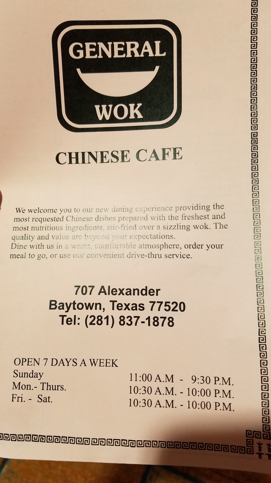 Read morePossibly the worst Chinese food I've ever had, and i've had a lot of chinese food from different places in my lifetime. Had the "Spicy Chicken" combo and it was neither spicy nor good; limp vegetables mixed with a watery gravy and some chicken. Did not taste any spice at all. Fried rice looked and tasted more like Mexican rice than it did Chinese. Egg Roll was burnt and extremely oily. Sweet and Sour pork looked like the meat was older than should be for safe public consumption (see picture). Returned food only to have the front counter lady give me a hard time about it. Bottom line: If you want to waste your money on food not fit for a dog to consume, please give General Wok a try. Never trust a Chinese restaurant that has no...