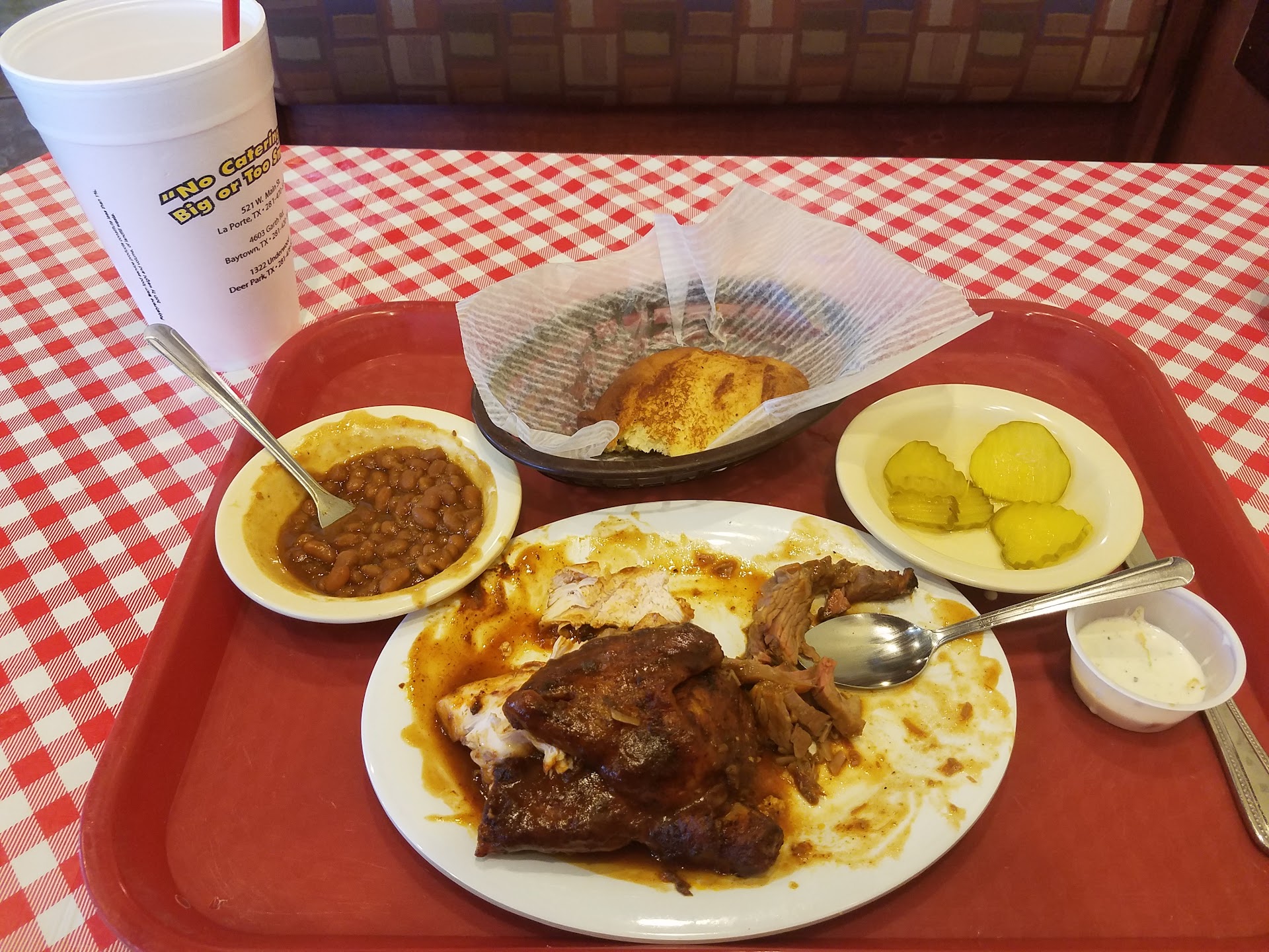 Read moreHad issues with my order being cold , not all ready when we arrived and when I asked for 3 baked potatoes with extra bbq sauce on the side and ranch dressings it wasn’t there. When I called the man told me well that they were busy , I continued to tell him that when he was done giving me excuses could I return for the missing condiments. I told him I spent 80 dollars and that I was unhappy. He said that lots of people had spent 100 dollars in there tonight. The man was yelling at me and I was yelling back. I have never been treated like this anywhere. He argued and made excuses and was totally rude. I asked if he was the mgr or owner and he said yes. When my daughter went to get the missing things he gave her a piece of cake like that was what I wanted. I just wanted what I paid for and oh I’m sorry come get your things. Not someone hollering at me making me feel like I was a bother. Unhappy and will think twice...