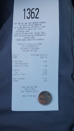 6-8-19. Honestly, if my sister-in-law didn't give me gift cards for McDonalds, I would NEVER come to this place (Alexander Drive/Business 146 in Baytown)! This morning, the drive through line was around the building. The woman standing at the extra order check-in podium had to be burning up in the heat. It's headed toward 100 degrees and there's someone standing on concrete in the sun?! Seriously?! I went inside. There were only a couple people already at tables, one woman waiting on her order. Several employees were in the "kitchen" and drive through areas. I waited for four minutes while employees blatantly ignored me standing a couple feet away. (Wanted to see how long it would take for them to at least make eye contact.) Finally, a young man wearing a light blue dress shirt strolled over, took my order, walked off. Without giving me my drink cup. Again, I was ignored several minutes until he returned to take another customer's order. He couldn't have looked more bored if he'd had facial surgery. In fact, none of the employees were hurrying. They meandered around as if they had all day. As if people weren't waiting. As if we who were waiting had nothing better to do with our time. Nearly ten minutes later, my order was ready. Ten minutes. Unbelievable. Did they have to slaughter the hog for my bacon? Grind the flour for my pancakes? The last time I was here three weeks ago, I went through the drive through. There were two vehicles in front of me, a very slow time period, I thought. My ticket said 11:26am. I was told to pull around to parking spot #3. At 11:46, I went inside to get my order. Twenty minutes to wait for a burger and fries. I told the (same) young man how long I'd been waiting. He looked at me with a, "Yeah, right!" expression. Until I showed him my receipt. I was given two apple pies for my troubles. This McDonalds has never been the best at tending to their customers' needs. To my disappointment, the dismal service has deteriorated to abysmal. I'm done coming here. I've told my sister-in-law not to give me McDonalds gift cards anymore. IMHO, the only reason this restaurant hasn't closed is due to its location, making it easy to "hurry" (pun intended) through to get cheap food....