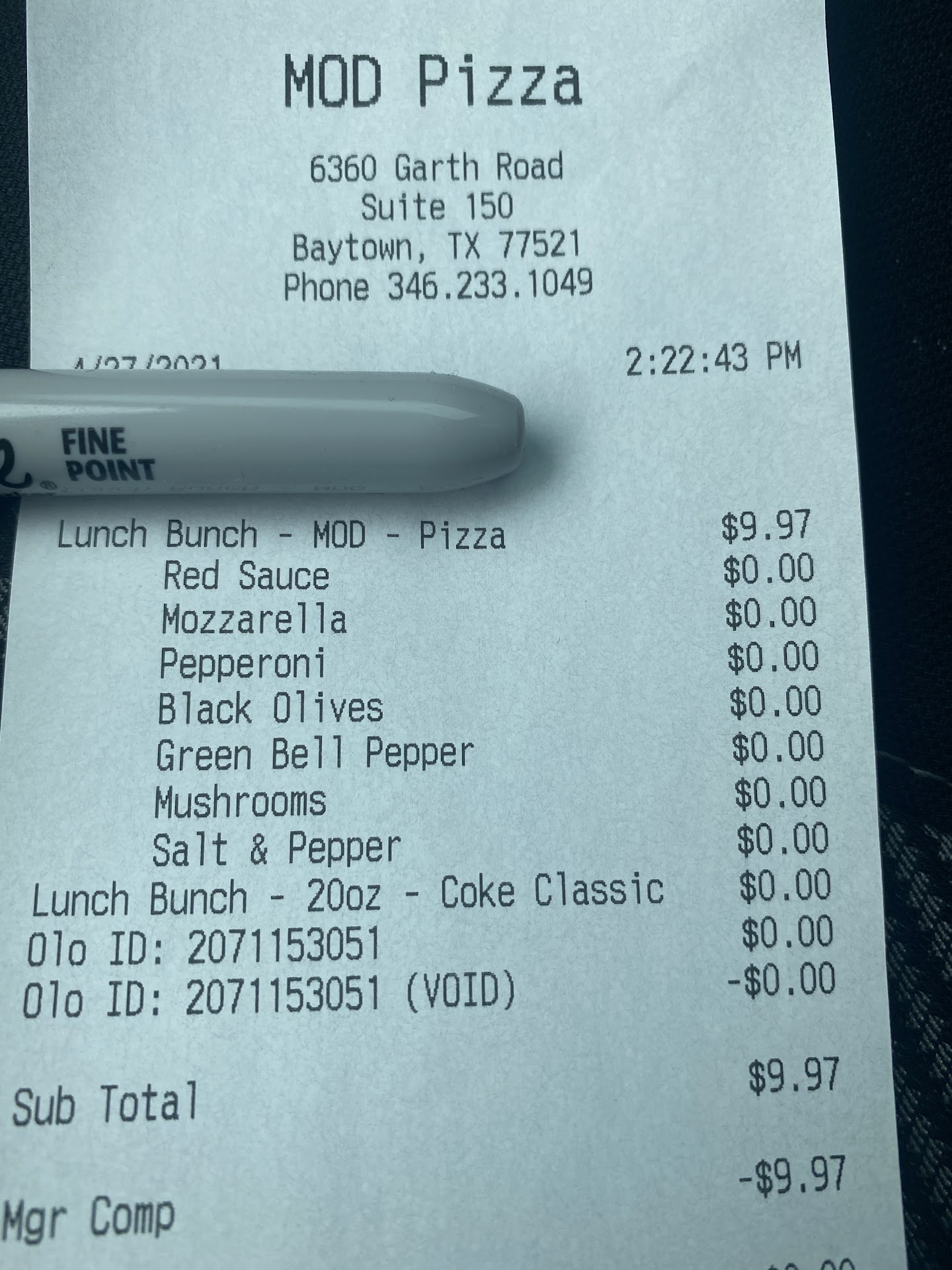 Read moreI got pizza from MOD Pizza in Mont Belvieu last weekend and it was amazing. My daughter and I planned to get pizza from there again tonight and wanted to get creative enjoying the various toppings. We opted for the location on Garth Rd and was a terrible choice. The manager waited on us and she made us feel like we were a bother. Most of the toppings bins were empty and I asked if they were going to re-fill them. The manager said they were not going to refill them even though it was an hour and a half until closing on a Friday night. I should have walked out then, but the sauce was already put on our order of 3 of the double crust pizzas and a cheese bread. The small amount of cheese in the bin was divided between the 4 crusts which did not begin to the cover the sauce. I had to ask for enough cheese to at least cover the dough. My daughter and I really wanted Bleu cheese crumbles, but they would not refill it. She did tell us to let her know what we wanted and they may be able to add it. Since this was only my second time to eat MOD Pizza, I had no idea what all was missing from the selection. We get home and open the pepperoni pizza - half of the pizza was only crust. This was my first and last visit to the Garth Rd location. Thankfully, the service and food from Mont Belvieu was outstanding and we will continue ordering from there. Don't waste your time or...