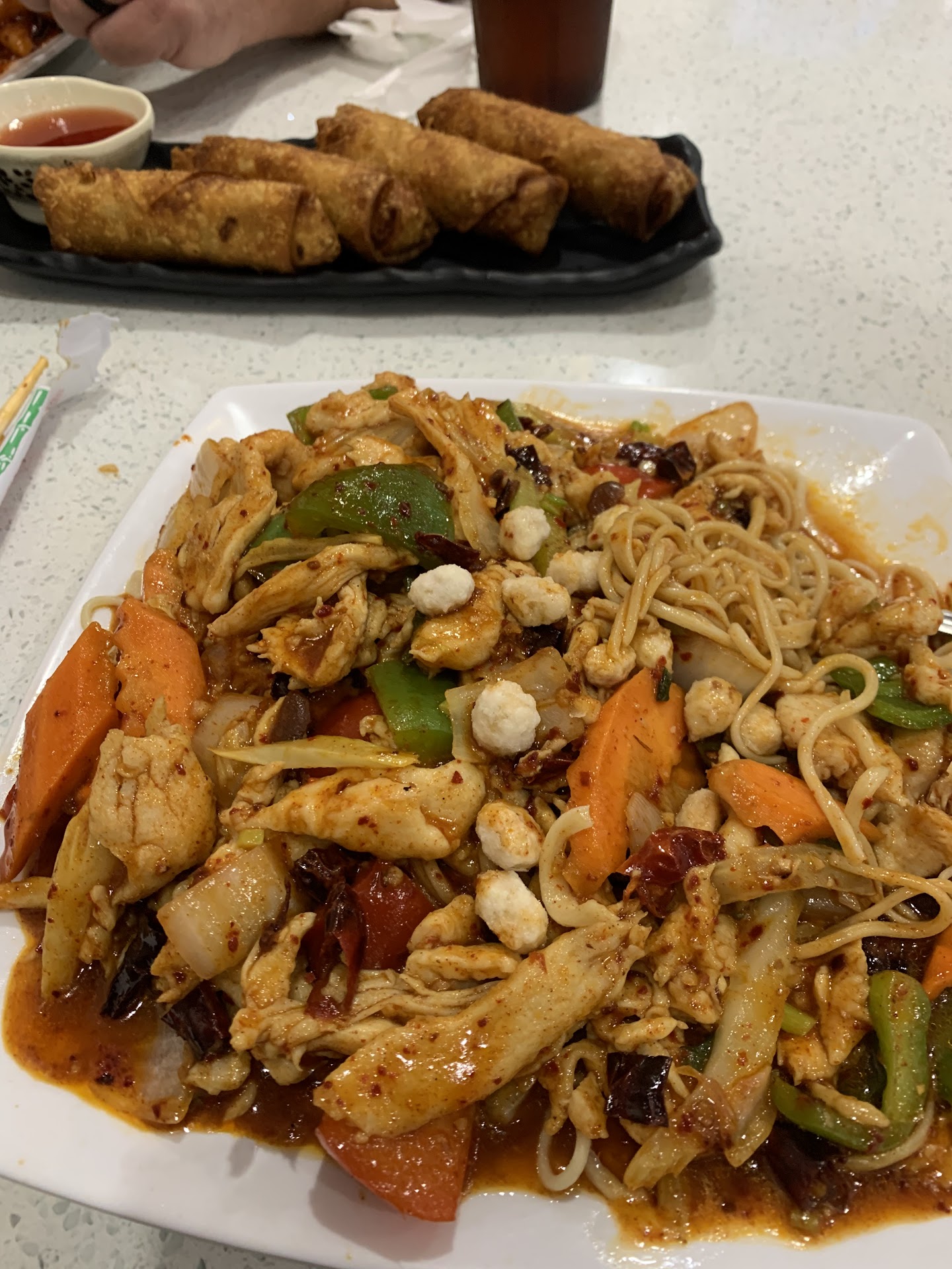 Fried noodles, combination no shrimp. We were warned they aren’t exactly lo mein but the closest they make but they’re right. If you want lo mein, that isn’t it. They had some sauce but some noodles weren’t covered and stuck together, the flavor isn’t right, the beef so tough and chewy, the chicken was tender and good flavored though. It’s plenty to share.