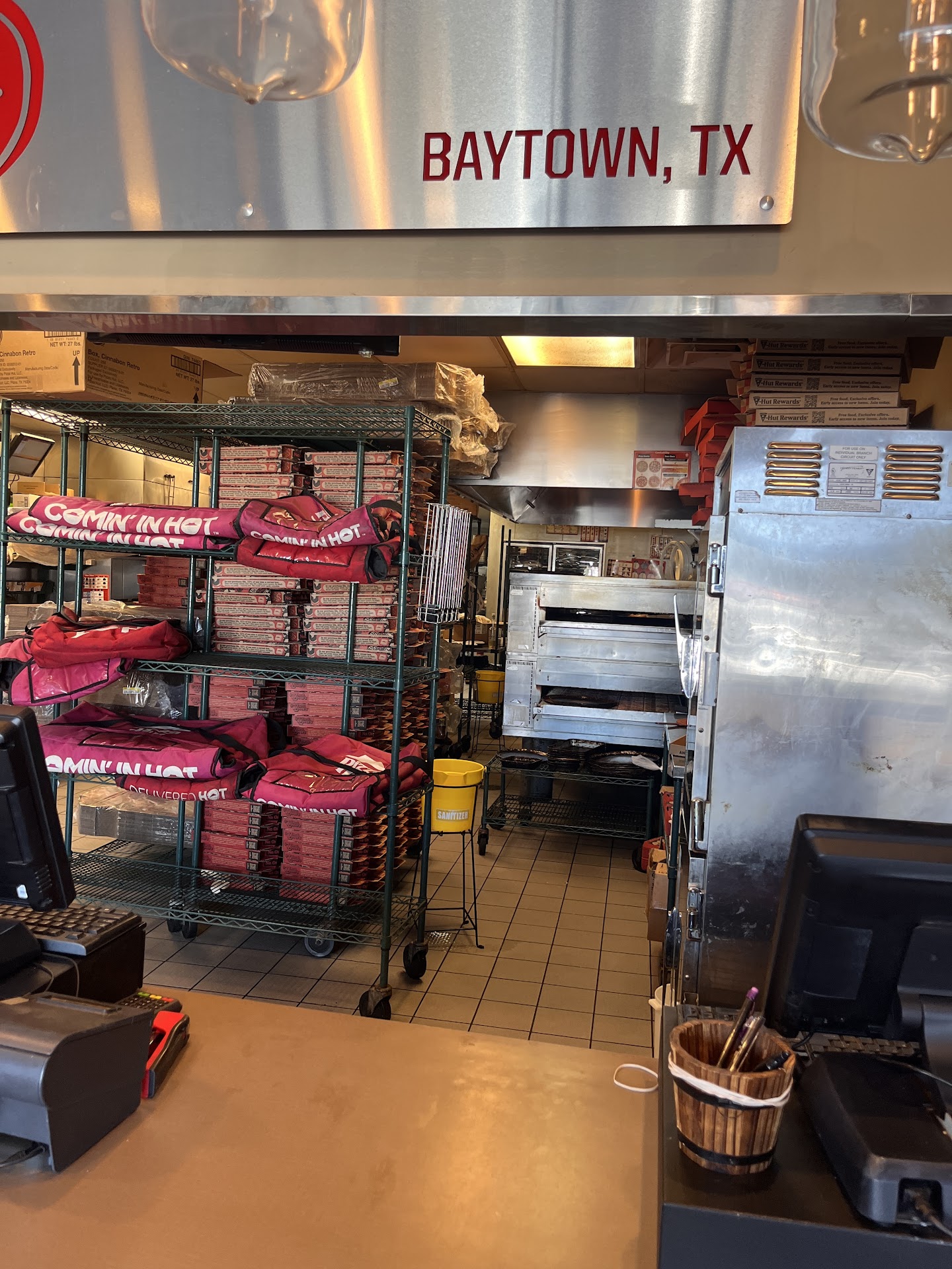 Read moreThis is a unsafe location in Baytown. I've ordered few times from here and idk why but the pizza always taste different then by Krogers. But this last time I went at 1020pm, the area surrounding is dark, people walking ,roaming around up to no good, popping up out of no where and I see in my rear mirrors and suddenly one comes up to a delivery drivers vehicle and checks handle and gets in and sits and checks for I'm assuming valuables and cash right in front of the store!!! I must have witnessed a robbery and I always have my doors locked while I wait for my husband. Then the workers have no respect twds the store manager and don't check the orders before being tooken out of the stores and complain that this would be the last delivery for the night!! Like really...also the manager seems to have little knowledge and let's the workers run over and speak to him however they please and he doesn't address it to them as needed. The environment is just awful, definitely don't suggest going here. Go to the one by Kroger, there pizza is very...