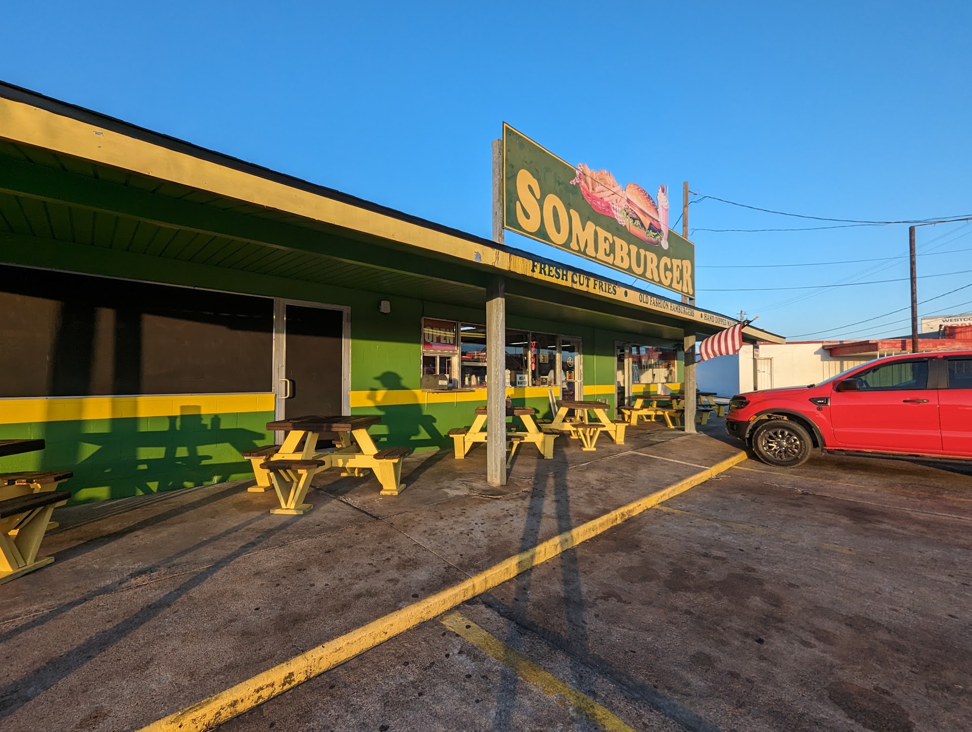 I haven’t eaten here in years, think 2007, just never remembered it being that great and remembered it being slow. I know a long time ago but I’m like that if something isn’t great. Yesterday, 8/2/23, ate here for lunch with my son when taking him to the college and it was AMAZINGLY delicious! The staff were friendly and efficient and our burgers and fries were out in record speed!!! We ordered the burger how it comes, the meat was tasty, the bun toasty and buttery, the toppings were proportionate perfection and the best part was that the tomatoes weren’t wet soupiness cut hours ahead of time (like Whataburgers) they were cut fresh so the burger didn’t ever get soggy - not even to the last bite. The homemade fries were a generous portion of fresh, super hot, and salty deliciousness. Both were so much better than Whataburger or any fast food. We did eat it there, outside, so didn’t travel with it which helped I’m sure. I wouldn’t drive away with one and expect the same fresh perfection. I honestly can’t...