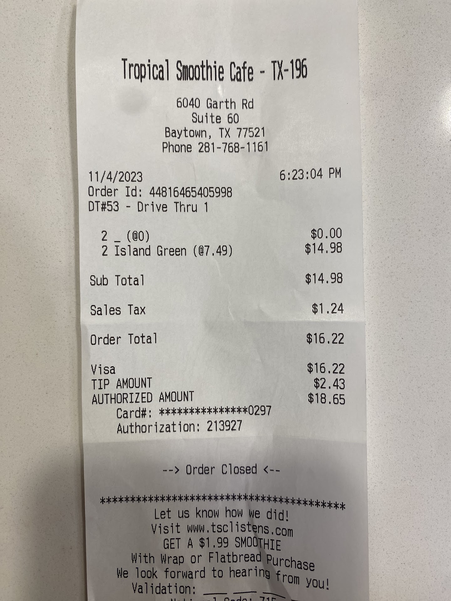 I arrive to 6040 Garth Rd Baytown for the first time at this Tropical Smoothie Cafe and it’s two workers in the facility this Sunday. No one greeted and no one asked did we need anytime. Customer Service is terrible- while I’m not going to say terrible but needs improvement. The female worker literally stop and was rubbing/ scratching her eye then proceeded to finish making smoothies. The Male stayed towards the back making wraps and parfaits. Because of no communication, the female worker prepared the smoothies and sat them by the cashier counter and went to the back. I had to say EXCUSE ME, the male didn’t hear me because he had headphones with music loud in his ear so he didn’t hear me. The female worker came ,asked me my name & gave me...