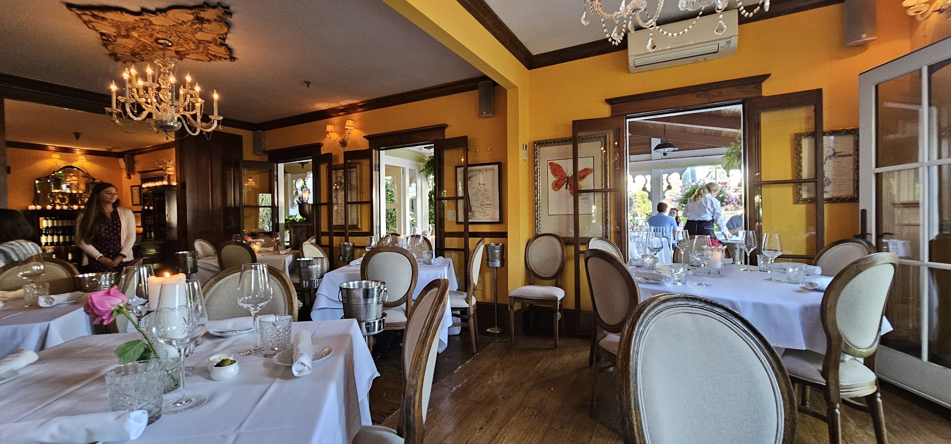 THe good: as mentioned the place is adorable. Ambience is good and not too loud, dimly lit. It turns out it is BYOB ( wish i had known!) and they also partner with a winery so they have well priced good of wines. The could be better: The hostess greeted us curtly and hesitated quite a bit as if it was a large request when we requested a seat on the patio. We were there mid september; it was NOT busy. we were seated at an awkward table that sits by a window to the house and is a thoroughfare for guests and staff. There were 2 tables on the perimeter, closer to the flowers, for 2 that lay unoccupied during our visit.