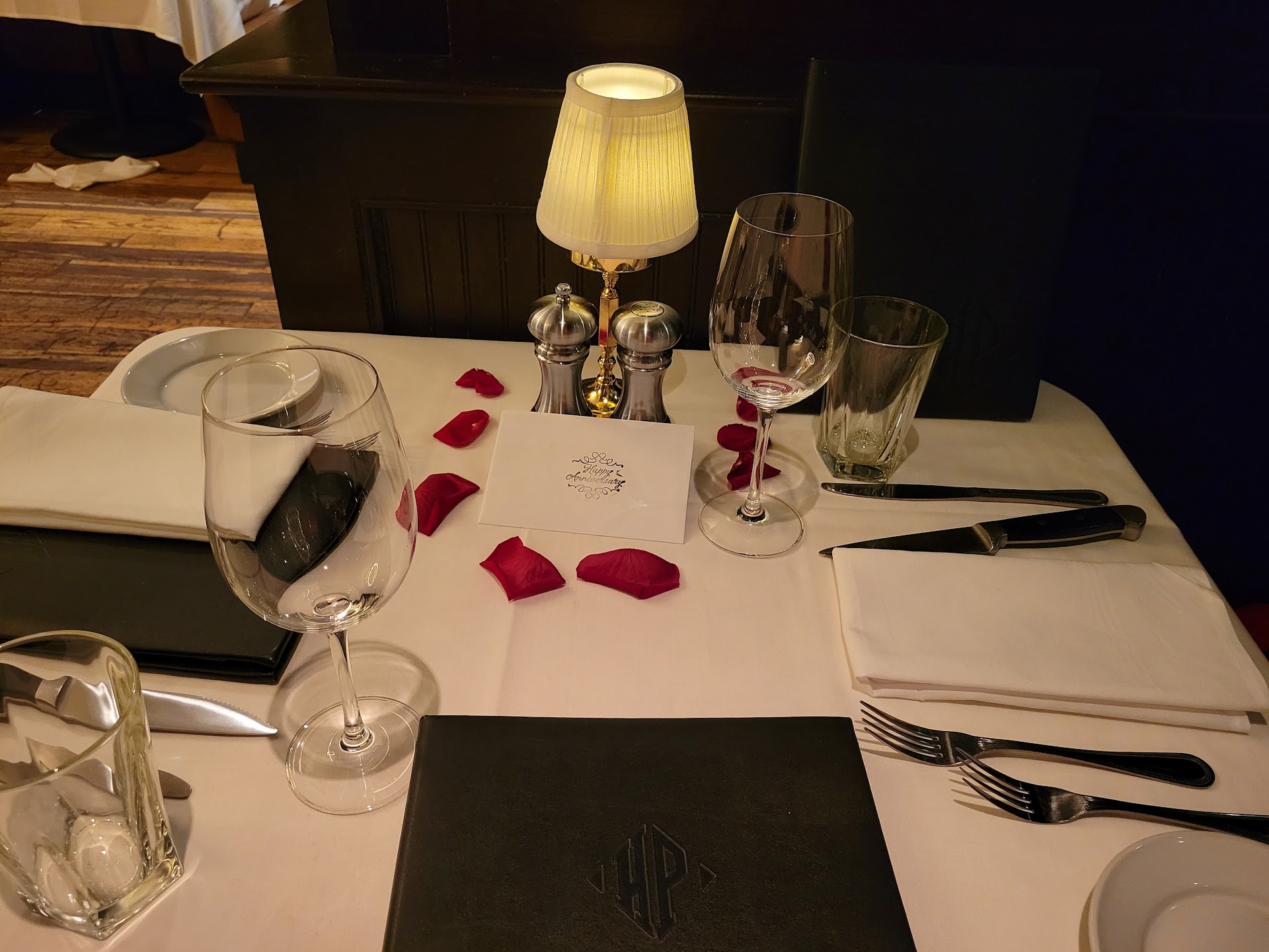 When we were brought to our table, we were pleasantly surprised by a sprinkling of rose petals on the table, and a card from Hyde Park congratulating us on our anniversary.
