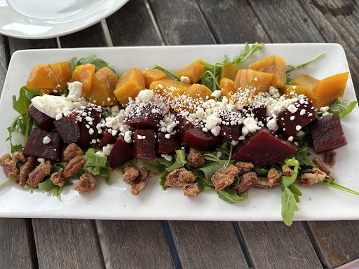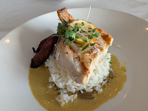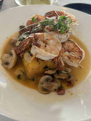 Tucked into an area with lots of boat docks and on the second floor, we weren't sure what to expect. What we experienced far exceeded those expectations! Service was excellent with a warm greeting from Dylan the host, and even friendlier service by our server Josie and several others who helped everyone with food orders and beverages. Speaking of bevs, Josie was very patient as we asked for more info on the wine menu, which she followed up with samples. The House Cava was not as dry as we liked, so we settled on some glasses of the excellent House Assyrtiko to start. The remainder of the Wine Menu was excellent, with many good to great wines in a range of prices. We ended up getting a bottle of the El Enemigo Chardonnay from Argentina, which went perfectly with our mains. Dylan is not only the host, but also the resident wine expert since he's working towards his Sommelier Certification! Not only was he helpful, but also very interesting and professional. We shared the Beet Salad because we really enjoy both red and golden beets, especially with the goat cheese, candied pecans, and maple-cider vinaigrette over arugula- very tasty! The "Bigs" menu was a mixture of southern specialties, local seafood, and other interesting creative dishes! I'm not a Shrimp and Grits fan normally because it is too creamy and rich for my stomach. However, the addition of andouille sausage and mushrooms with a sauce or broth that seemed more like a roux, and the expertly grilled six shrimp placed over 2 very tasty grit cakes was too good sounding to pass up. I loved it! If I had anything to critique, it might be less salt in the cakes, because the andouille added plenty to each bite! My wife was feeling less adventurous, so decided to try the Roasted Airline Chicken. Some people believe this dish is very simple, but we think that it separates the good from the skilled Chefs. And the Chef prepared this dish with great skill and creativity! He added a mushroom curry and fig chutney to the plantains and jasmine rice, which complemented the chicken very well. We ended the night with a beautiful sunset that was enjoyed by many of the patrons as evidenced by their pictures! Because it was my wife's birthday, Josie recommended we try their specialty, the Sticky Toffee Pudding, which was excellent, and not heavy or filling. They didn't charge us for that, another classy decision. Overall, this has been one of our best meals on the Crystal Coast. And we will certainly be back to enjoy another...