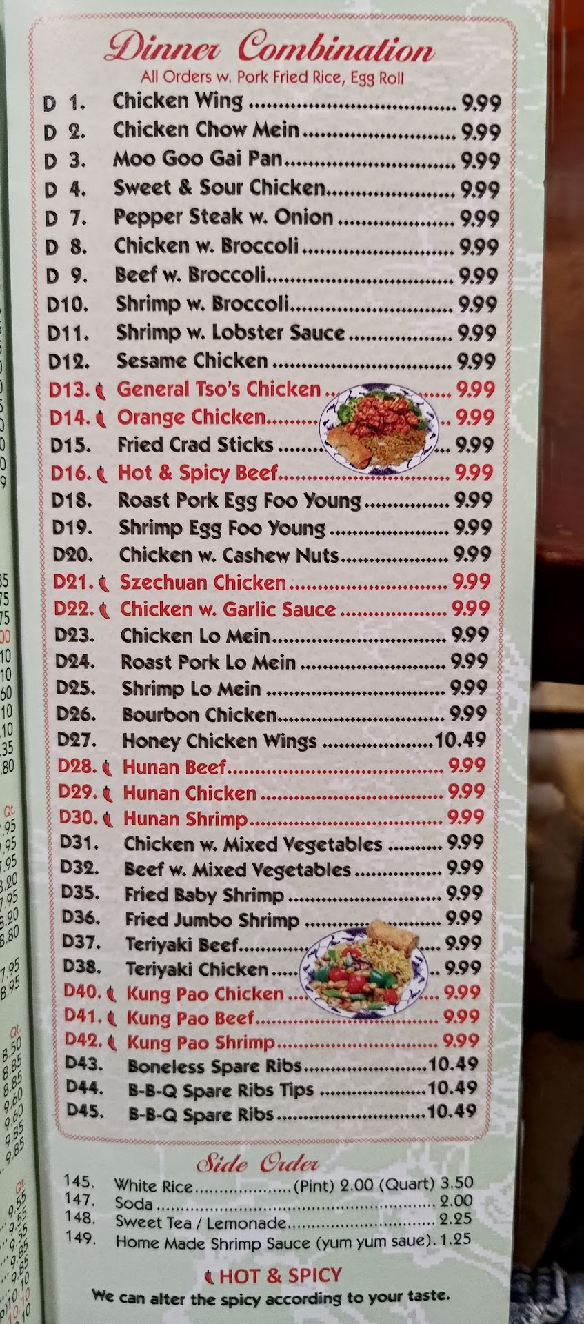 Read moreThere is no way this restaurant is the quality of food deserving of a 4.2 review. That puts it at the quality of some fine restaurants in the area. My meal was nasty it was suppose to be chicken curry. I couldn't taste the curry at all it was over whelmed by hot pepper flakes. Curry is spicy in itself if they put a adquite amount of curry not only would you taste it but it would give the dish a spicy kick and it would never need red pepper flakes. The sauce was thick and gloppy making it more of a paste rather than a sauce. I am a vegetable lover which they added to the dish they added mushrooms, corn, green pepper, onion,water chestnuts, and scallions, the problem with all those vegetables is there was a ton of those and very little chicken in the"Chicken Curry Dinner" which is what I thought I ordered. The building is a dump with plastic chair giving the feeling of a mess hall. I believe this restaurant is far over rated it no...