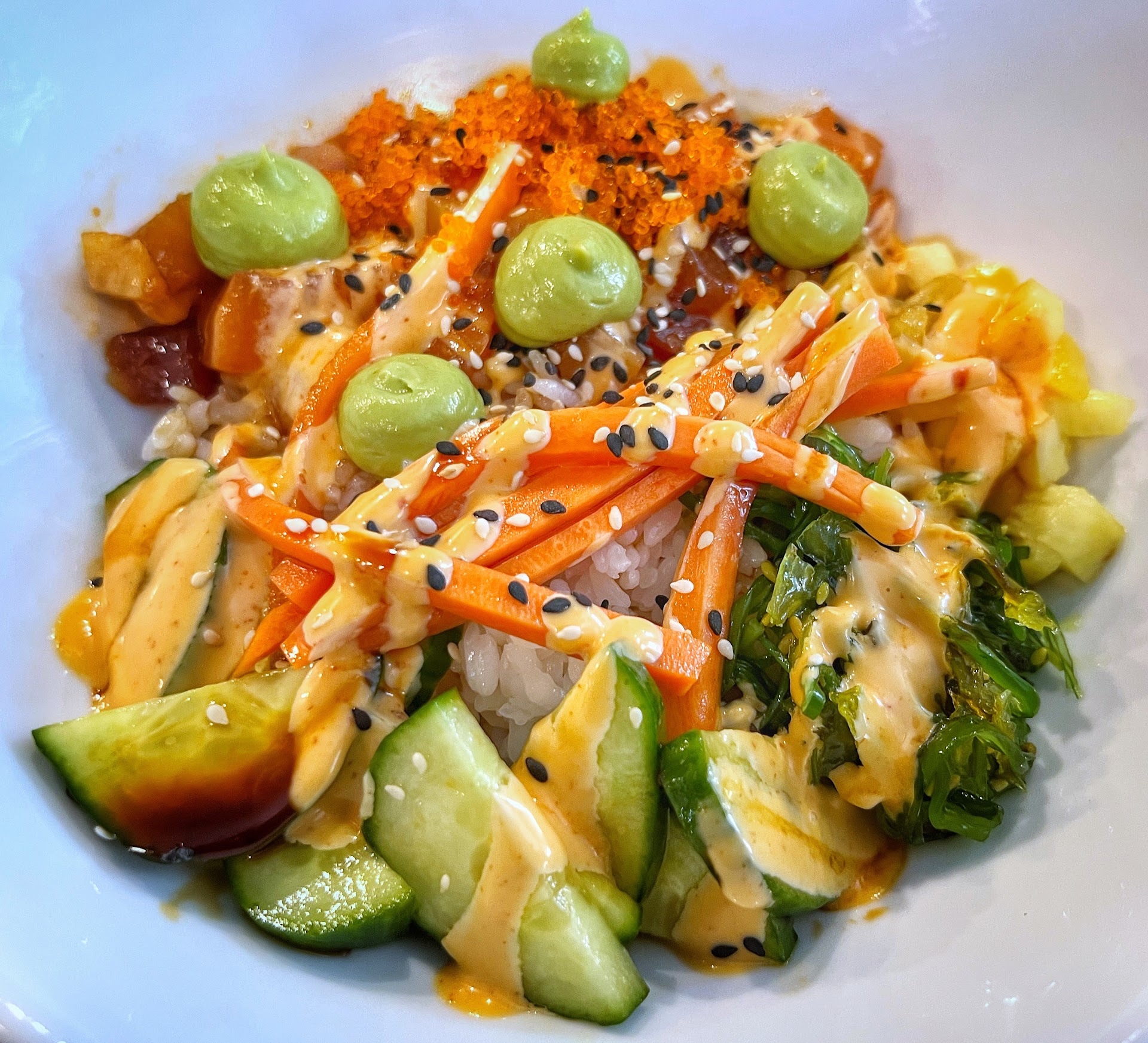 I indulged in their poke bowl; today’s fish included an exquisite mix of tuna, salmon, and yellowtail. Each morsel was a testament to the freshness and quality of their seafood selection. The flavors were amplified by their house-made sauces and a delightful addition of pineapple, adding a sweet-tangy twist to the dish.
