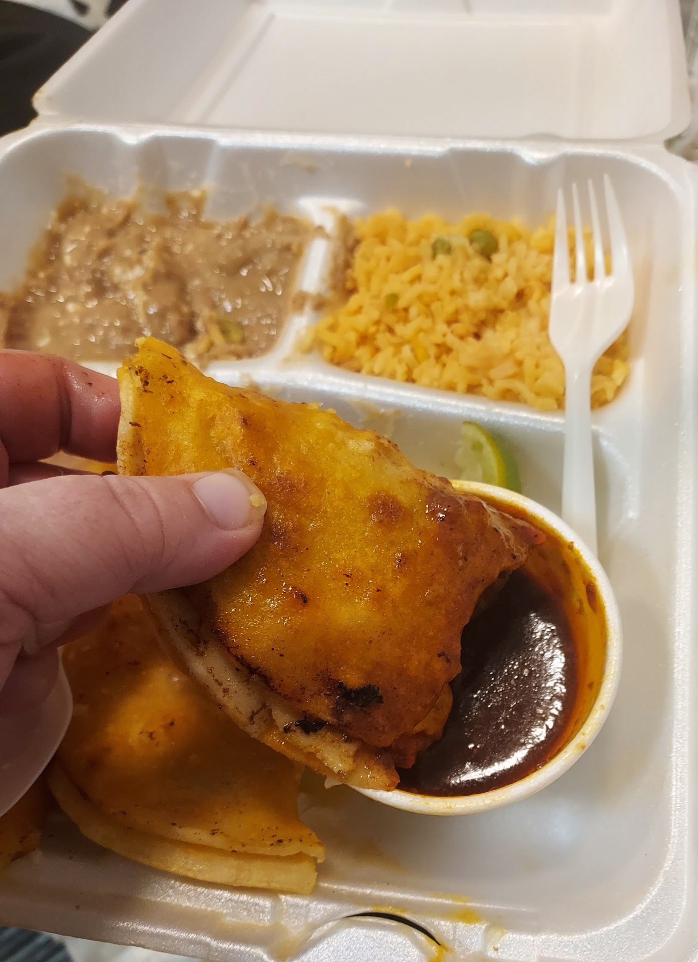 Read moreI ordered pick-up through DoorDash and got the Birria Tacos. Since I paid online all I had to do was walk in and tell them my name at the front counter. They had everything hot and ready for me. I got home and opened my box and found 3 very large Birria Tacos that came with the dipping sauce ( I can't remember what it's called) a side of rice and beans and a single serving of chips and hot sauce. I think it came with a tiny green sauce to pour on the tacos also. The tacos were full of meat, which is surprising nowadays. I dipped them in the sauce and when I say they were so good, I wanted to slap my momma. I had made the biggest mess eating them lol. The dipping sauce was all but running down my arms and all over my face. But they were the good kind of messy. The beans and rice were standard, nothing to write home about, but not bad at the same time. The star of the order was definitely the tacos. The chips were very good and crispy and fresh. The sauce had a kick but not a throat punch, which is how I like it. I highly, highly recommend trying the Birria Tacos if you get the...