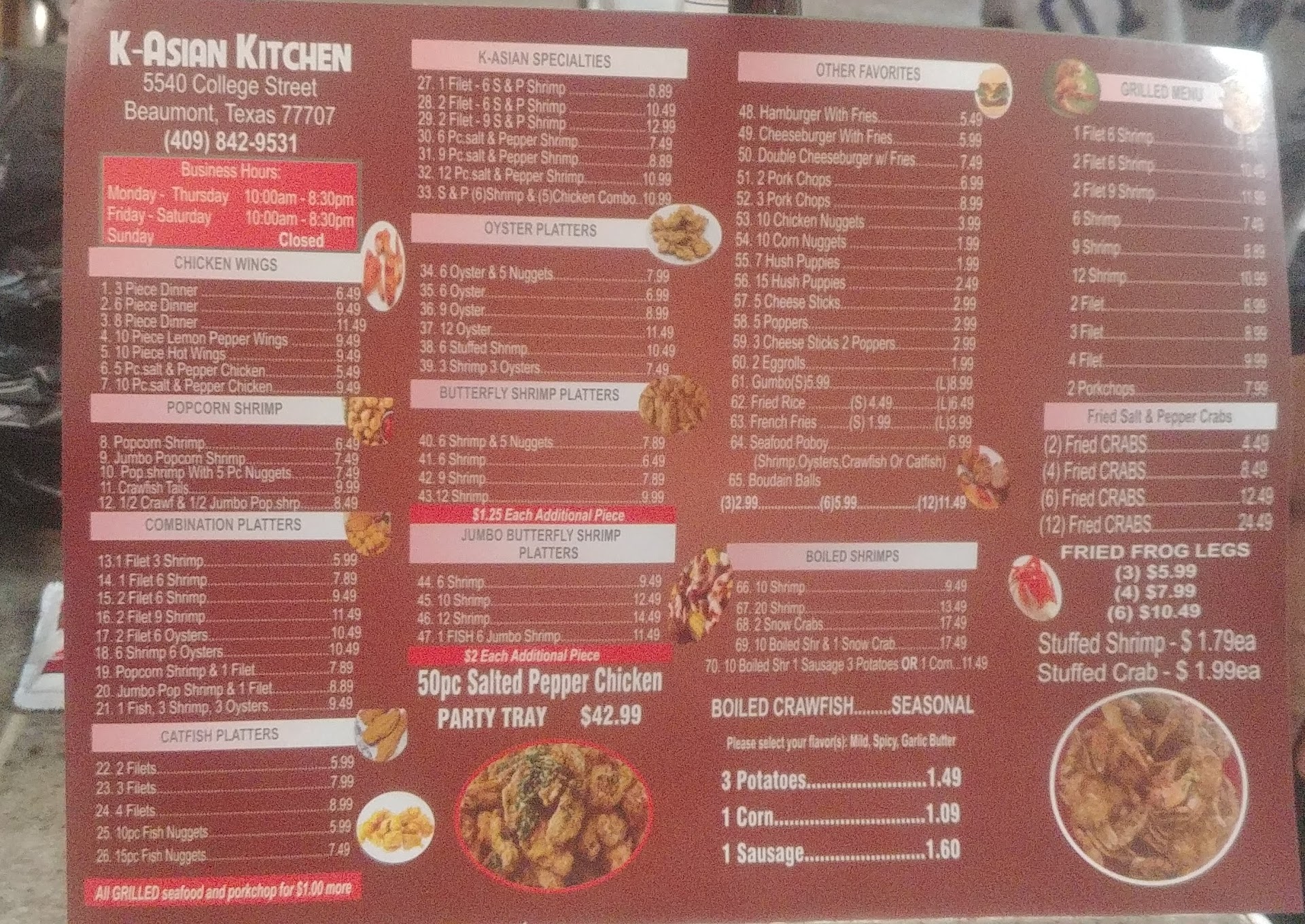 Read moreThis weekend im spending some time with my Fiance in Beaumont Texas. Hadn't gotten a chance to eat anything much today but im in the mood for Seafood. There are lots of Places in town that sells Seafood, but. I want good seafood. Usually my Number 1 spot of course would be Pappadeauxs Seafood Kitchen located on I-10 South, Beaumont Texas. But I have found another great place called K-Asian Kitchen located at 5540 College Street in Beaumont Texas that serves some great seafood. The menu is pretty big with lots of delicious combinations including fish fillets, Shrimp, Fried Oysters, Fried frog legs, Fried Pork Chops, Fried Chicken wings all served with fried rice or French fries, Cheese Burgers, Boudin Balls, and many many more delicious dishes to choose from, and this place is always packed. The boil Crawfish are incredible. I get crawfish there a few times a year when crawfish are in Season and I haven't been disappointed yet. The staff is already friendly and courteous and always greets you with a smile. So if you're in the Beaumont Texas area check out K- Asian Kitchen. I guarantee you will not be...