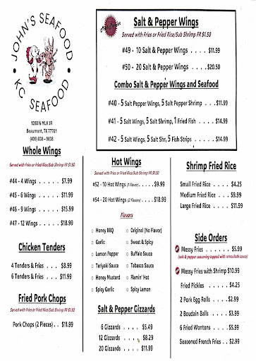 Read more28SEP25 KC Seafood Review Intersection of Gladys and MLK. Cheery counterperson-Lady who helped me with my food selection. Salt & Pepper Shrimp and Chicken Wings. Fried Rice. Cooked up, served hot, with packets of condiments. Shrimp and Chicken covered in a medium thick batter, large amounts of S&P and scallion shreds. Crunchy, neutral batter flavor, juicy meats, each tasting as expected. Heat, garlic, salt and honest pepper sting and tingle. Rice provided is abundant, al dente, tasting round and rich. Nothing missing and nothing ‘extra’ in flavor. Nice meal, Solid Quality-Price Ratio....