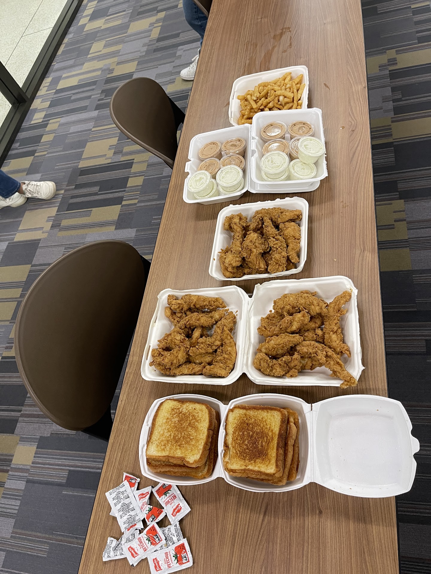However, if you are ordering large orders, please check your food and make sure they have everything correct. I recently ordered two of the family packs. One family pack consists of 20 pieces of chicken amongst fries and toasts. My order consisted of one regular family pack and one spicy family pack, which comes out to a total of 40 chicken tenders. After receiving the order, I opened the package at home and realized they had only given me 30 pieces of chicken all regular. I called and the best they could do was provide me the remaining ten of my chicken in the spicy flavor and two free fountain drinks. This was so disappointing, especially since it was for an event. If it was busy, it would have been understandable, but there was not a single soul when I went inside.