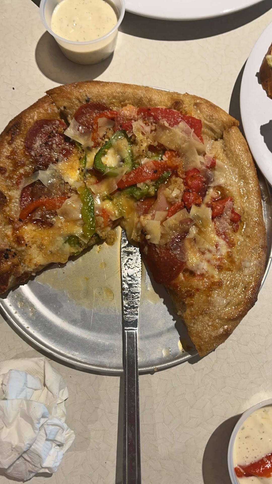 SuperPepp pizza (10in) was a surprising taste challenge. on a crispy crust was rich red sauce, mozzarella, smokey pepperoni, tangy-tingly pepper bits, several little mounds of seasoned, creamy ricotta cheese with a generous swirl of hot honey. Man, this is some special, monumental output of a crazy mad scientistās flavor experiment. As the cliche states, āa delight in every bite.ā